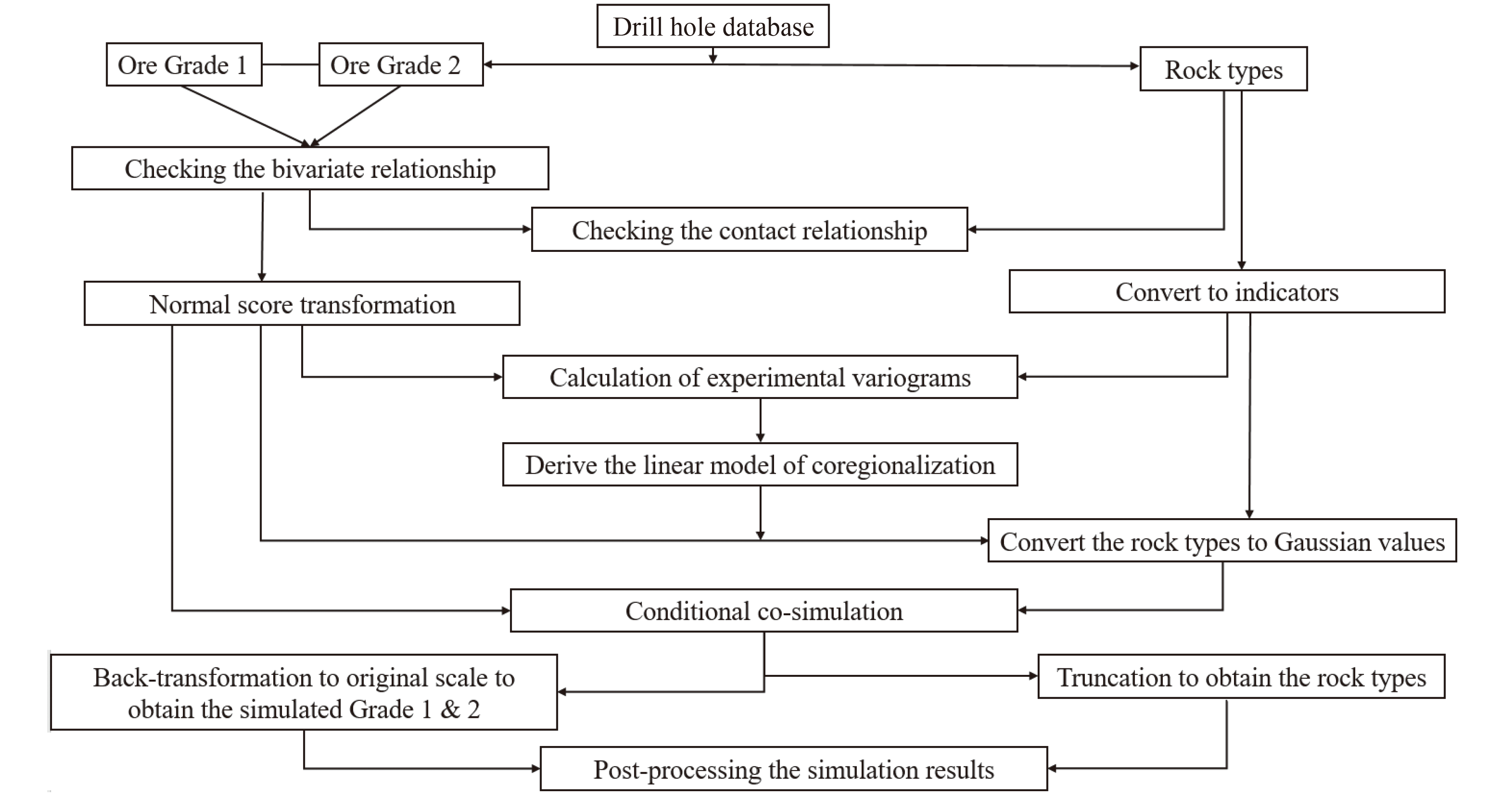 Spatial modeling of ore grades is frequently impacted by the local variation in geological domains such as lithological characteristics, rock types, and geological formations. Disregarding this information may lead to biased results in the final ore grade block model, subsequently impacting the downstream processes in a mining chain project. In the current practice of ore body evaluation, which is known as stochastic cascade/hierarchical geostatistical modeling, the geological domain is first characterized, and then, within the geological model, the ore grades of interest are evaluated. This practice may be unrealistic in the case when the variability in ore grade across the boundary is gradual, following a smooth transition. To reproduce such characteristics, the cross dependence that exists between the ore grade and geological formations is considered in the conventional joint simulation between continuous and categorical variables. However, when using this approach, only one ore variable is considered, and its relationship with other ore grades that may be available at the sample location is ignored. In this study, an alternative approach to jointly model two cross-correlated ore grades and one categorical variable (i.e., geological domains) with soft contact relationships that exist among the geological domains is proposed. The statistical and geostatistical tools are provided for variogram inference, Gibbs sampling, and conditional cosimulation. The algorithm is also tested by applying it to a Cu deposit, where the geological formations are managed by the local and spatial distribution of two cross-correlated ore grades, Cu and Au, throughout the deposit. The results show that the proposed algorithm outperforms other geostatistical techniques in terms of global and local reproduction of statistical parameters.