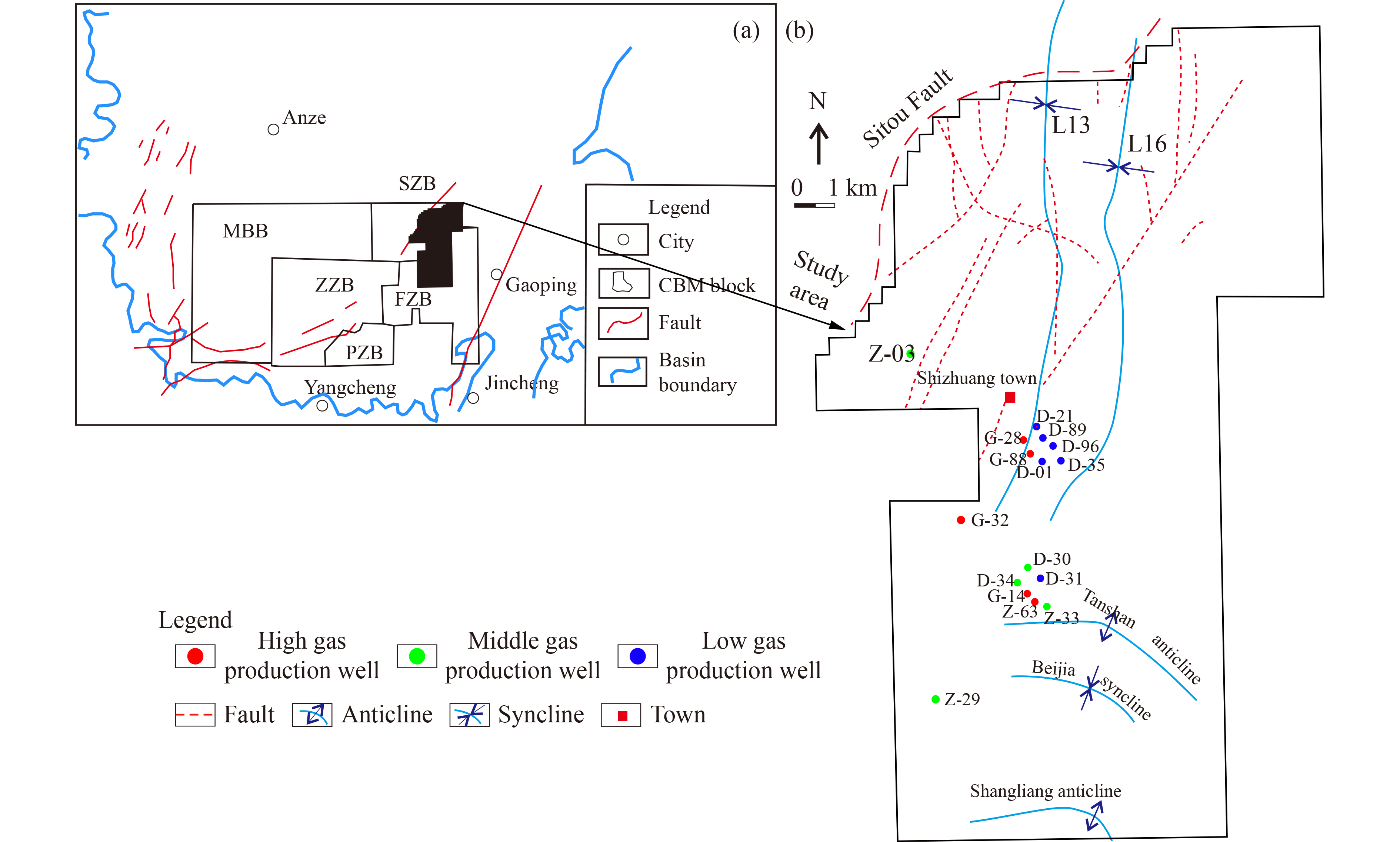 The Daning-Jixian block, the eastern edge of the Ordos Basin, is one of the most potential areas for CO2 geological storage, enhanced coalbed methane recovery (ECBM) exploration and production in China in recent decades. The ionic composition and total dissolved solids (TDS) of the produced water, coal organic matter maturity, molecular composition and carbon isotope characteristics of the produced gas were utilized to analyze the hydrogeological condition, CBM generation and migration characteristics in this area. The CBM enrichment patterns and the geological impacts on gas well production characteristics were revealed. The optimal area for CBM development and CO2 geological storage in the study area were also proposed. Dominated by the Xueguan reverse fault zone, the hydraulic unit in this area can be divided into two parts (i.e., the recharge-runoff zone in the east and the weak runoff-stagnation zone in the west). The thermogenic gas is dominating CBM genesis in this area. Secondary biogenic gas replenishment is only distributed in the eastern margin area, where the δ13C1 value is less than the thermal simulation results as an influence of hydrodynamic fractionation. Finally, two models of CBM formation and accumulation were proposed, 1) thermogenic CBM migrated by hydrodynamic and resorbed for preservation at impermeable fault boundaries; 2) thermogenic CBM trapped by fault and accumulated by hydrodynamic in slope zone. The gas production performance, generally increased from east to west, is mainly dominated by hydrogeological conditions. Generally, the west side of the fault zone is the enrichment and high-yield area for ECBM development and CO2 geological storage in the study area.