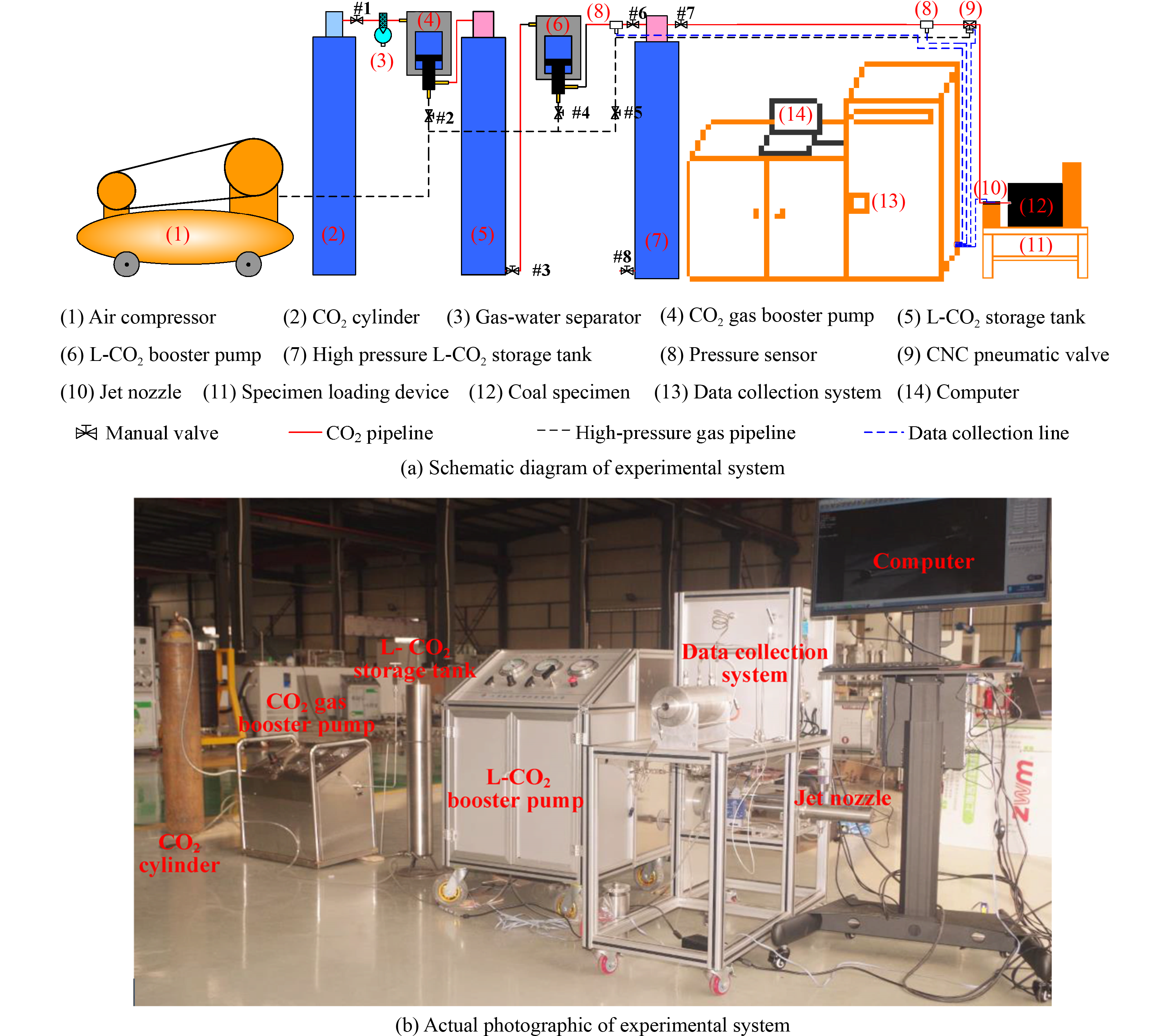 Due to the limited permeability and high methane content of the majority of China’s coal seams, significant coal mining gas disasters frequently occur. There is an urgent need to artificially improve the permeability of coalbed methane (CBM) reservoirs, enhance the recovery efficiency of CBM and prevent mine gas accidents. As a novel coal rock fracture technology, the CO2 phase transition jet (CPTJ) has been widely used due to its advantages of safety and high fragmentation efficiency. In this study, to ascertain the effects of the pressure of CPTJ fracturing, the influence of its jet pressure on cracked coal rock was revealed, and its effect on CBM extraction was clarified. In this research, the law of CPTJ pressure decay with time was investigated using experimental and theoretical methods. Based on the results, the displacement and discrete fracture network law of CPTJ fracturing coal rock under different jet pressure conditions were studied using particle flow code numerical simulation. Finally, field experiments were conducted at the Shamushu coal mine to assess the efficiency of CPTJ in enhancing CBM drainage. The results showed that the pressure of the CPTJ decreased exponentially with time and significantly influenced the number and expansion size of cracks that broke coal rock but not their direction of development. CPTJ technology can effectively increase the number of connected microscopic pores and fractures in CBM reservoirs, strongly increase the CBM drainage flow rate by between 5.2 and 9.8 times, and significantly reduce the CBM drainage decay coefficient by between 73.58% and 88.24%.