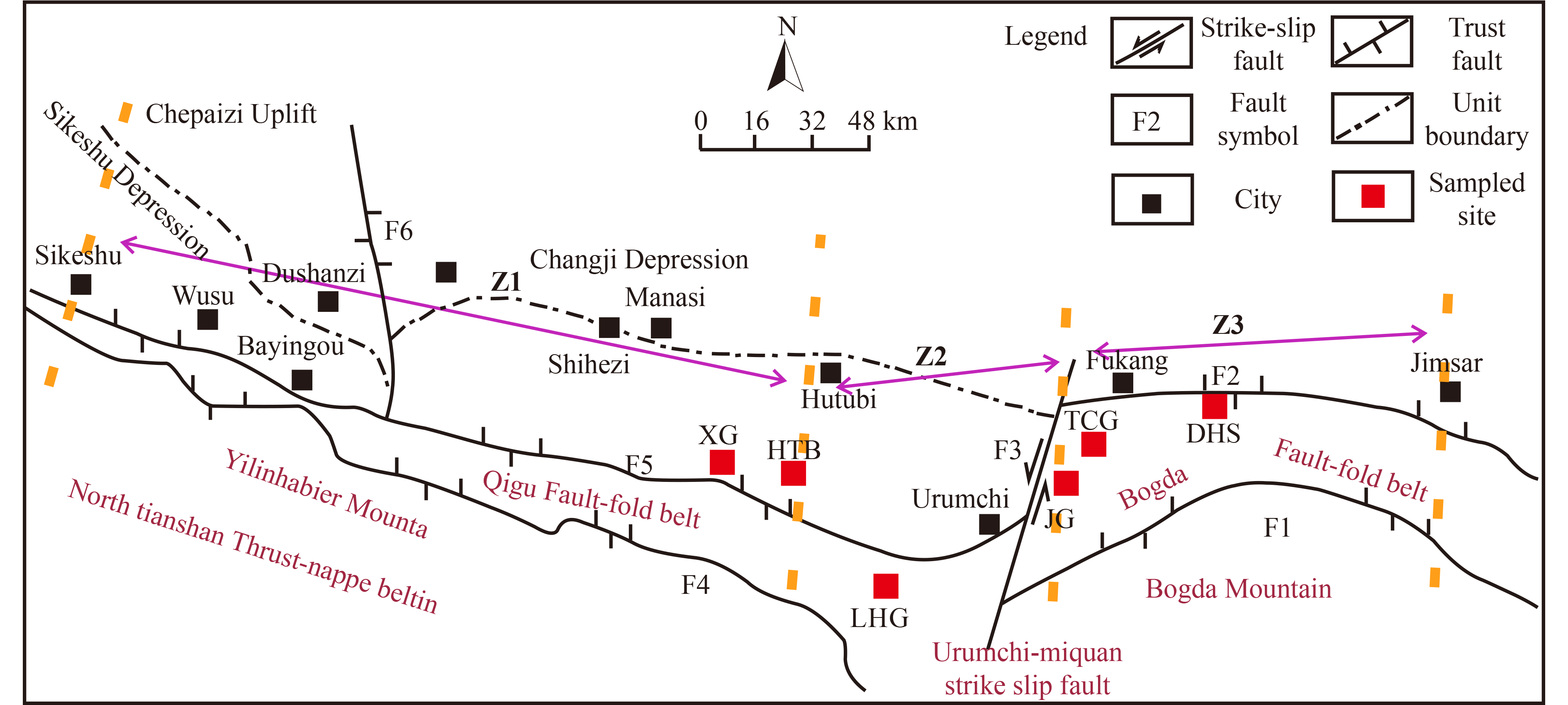 Carbon capture, utilization, and storage (CCUS) is considered one of the most effective measures to achieve net-zero carbon emissions by 2050, and low-rank coal reservoirs are commonly recognized as potential CO2 storage sites for carbon sequestration. To evaluate the geological CO2 sequestration potential of the low-rank coal reservoirs in the southern margin of the Junggar Basin, multiple experiments were performed on coal samples from that area, including high-pressure mercury porosimetry, low-temperature N2 adsorption, overburden porosity and permeability measurements, and high-pressure CH4 and CO2 isothermal adsorption measurements. Combined with the geological properties of the potential reservoir, including coal seam development and hydrodynamic characteristics, the areas between Santun River and Sigong River in the Junggar Basin were found to be suitable for CO2 sequestration. Consequently, the coal-bearing strata from Santun River to Sigong River can be defined as “potentially favorable areas for CO2 sequestration”. To better guide the future field test of CO2 storage in these areas, three CO2 sequestration modes were defined: 1) the broad syncline and faulted anticline mode; 2) the monoclinic mode; 3) the syncline and strike-slip fault mode.