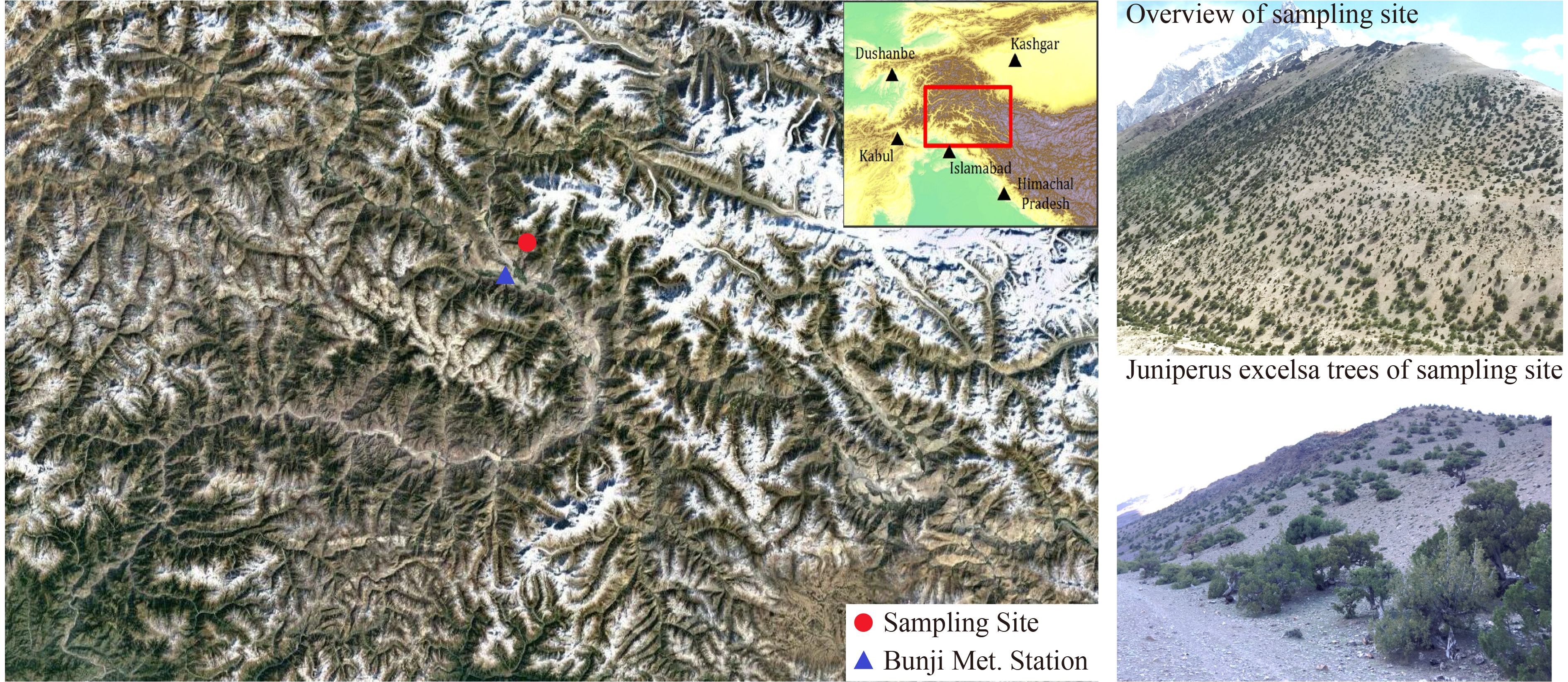 Long-term high resolution climate proxies are essential for understanding climate variability particularly, in regions such as the western Himalayas of northern Pakistan, where few long-term climate records are available. Using standard dendrochronological methods, an 1132-year (882 to 2013 C.E.) tree-ring chronology of Juniperus excelsa M. Bieb was established from the western Himalayas, northern Pakistan (WHNP). Tree growth was negatively and significantly (r = −0.65) correlated with the growing season (June–July) mean temperature, and positively and weakly (r = 0.22) associated with precipitation. This inverse relationship of tree radial growth with temperature and positive association with precipitation demonstrated that forest growth is sensitive to high temperature related drought. Utilizing a reliable STD chronology and robust reconstruction model, a 928-year (1086 to 2013 C.E.) mean temperature reconstruction was developed for the WHNP using the substantial negative correlation between the summer temperature and standard tree ring-width chronology. According to statistical validation, the reconstruction accounted for 41.6% of the climatic variation for the period of 1956–2013 C.E. instrumental period. Individual extreme-warm periods occurred in 1093 C.E. (29.42°C) and extreme cold periods in 1088 C.E. (26.99°C) observed during the past 928 years. The reconstruction's multi-taper method (MTM) spectral analysis reveals significant (p < 0.05) 2–3-year and 63.8-year cycles. Since the 2–3-year cycle occurred within the range of ENSO variation, which indicates that ENSO had an impact on the regional temperature in our studied area.
