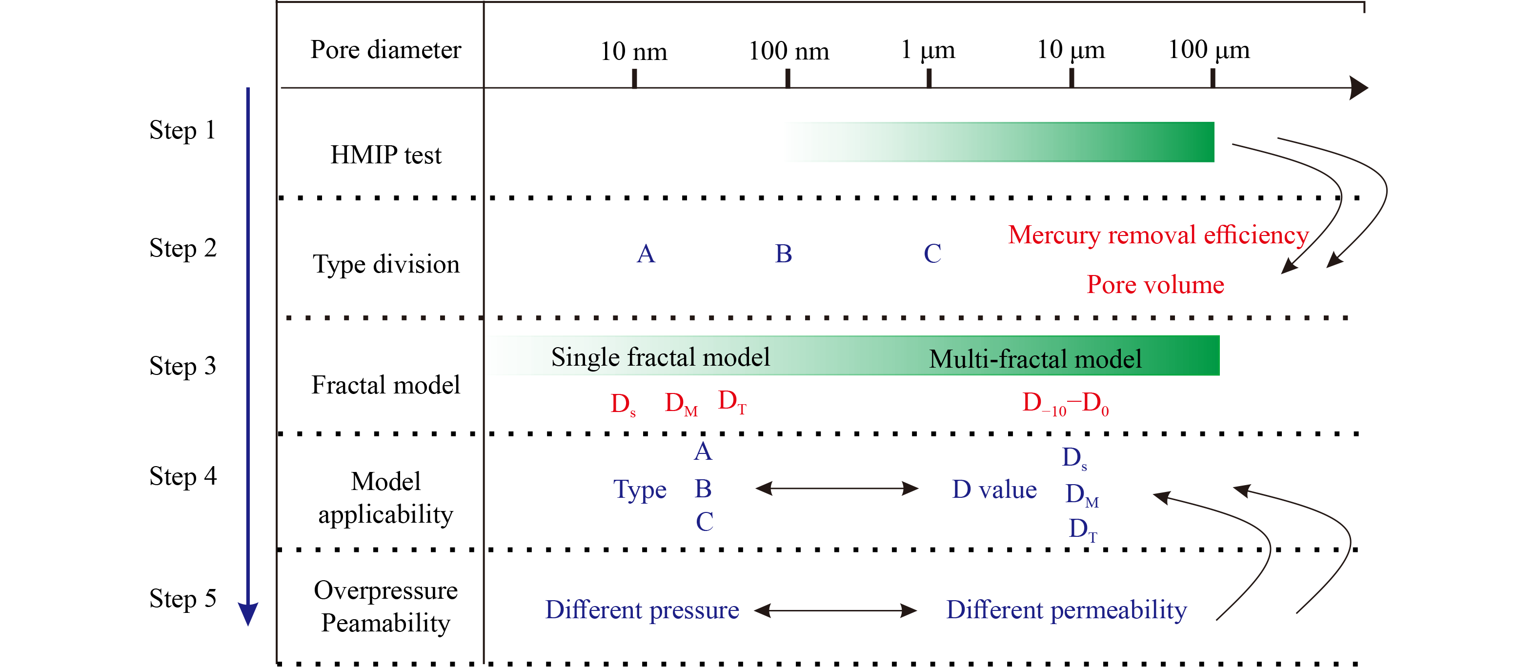 Pressure mercury intrusion test is (MIP) one of the most commonly used methods to characterize pore-fracture structure. Here, we use the fractal dimension of the mercury intrusion curve to analyze the heterogeneity of pore and fracture distribution. Differing from the intrusive mercury curve, the extrusive curve provides a better representation of the seepage capacity of a reservoir. In this paper, the division method of sample types using both mercury invasive parameters (pore volume, pore volume percentage, porosity, permeability) and extrusive parameters (mercury removal efficiency) is discussed. The fractal dimension values of mercury intrusive and extrusive curves are calculated for all samples using the Menger, Thermodynamics, and Multifractal fractal models. Moreover, the fractal significance of the mercury withdrawal curve is examined. The results are as follows. 1) The samples can be divided into three types based on the mercury removal efficiency and total pore volume. Type A is characterized by lower total pore volume (< 0.08 cm3·g−1) and removal efficiency (< 30%), type B has lower total pore volume (< 0.08 cm3·g−1) and higher removal efficiency (> 30%), and type C has larger total pore volume (> 0.08 cm3·g−1) and higher removal efficiency(> 30%). 2) Mercury removal efficiency does not correlate with the mineral composition or total pore volume, but it does show a clear positive correlation with pore volume in the range of 100 to 1000 nm. Unlike the Menger model, the mercury removal curve analyzed using the thermodynamics and multifractal model shows good fractal characteristics. 3) In contrast to the injective curves, the fractal dimension of mercury removal curves exhibits an obvious linear negative correlation with pore structure parameters and mercury removal efficiency. Moreover, the multifractal dimensions D0–D10 obtained from the mercury removal curves show a negative correlation with porosity and permeability. This indicates that fractal dimension based on the mercury extrusion curve can be used as a new parameter for characterizing pore-fracture structure heterogeneity.
