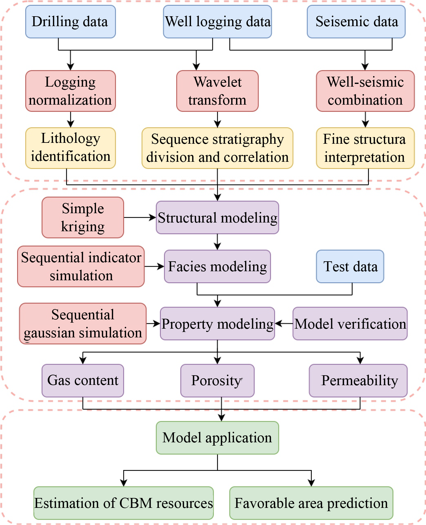 Qinshui Basin possesses enormous deep coalbed methane (CBM) resources. Fine and quantitative description of coal reservoirs is critical for achieving efficient exploration and development of deep CBM. This study proposes a 3D geological modeling workflow that integrates three parts: geological data analysis, 3D geological modeling, and application of the model, which can accurately predict the favorable areas of CBM. Taking the Yushe-Wuxiang Block within the Qinshui Basin as a case study, lithology identification, sequence stratigraphy division, structural interpretation is conducted by integrating well logging, seismic, and drilling data. Six lithology types and regional structural characteristics of the Carboniferous-Permian coal-bearing strata are finely identified. Combining experimental testing on porosity and gas content and well testing on permeability, a 3D geological model that integrates the structural model, facies model, and property model was established. Utilizing this model, the total CBM resource volume in the study area was calculated to be 2481.3 × 108 m3. Furthermore, the model is applied to predict the distribution ranges of four types of CBM favorable areas. The workflow is helpful to optimize well deployment and improve CBM resource evaluation, ultimately provide theoretical guidance for subsequent efficient exploration and development. Our study constitutes a reference case for assessing potential of CBM in other blocks due to the successful integration of multiple available of data and its practical applications.