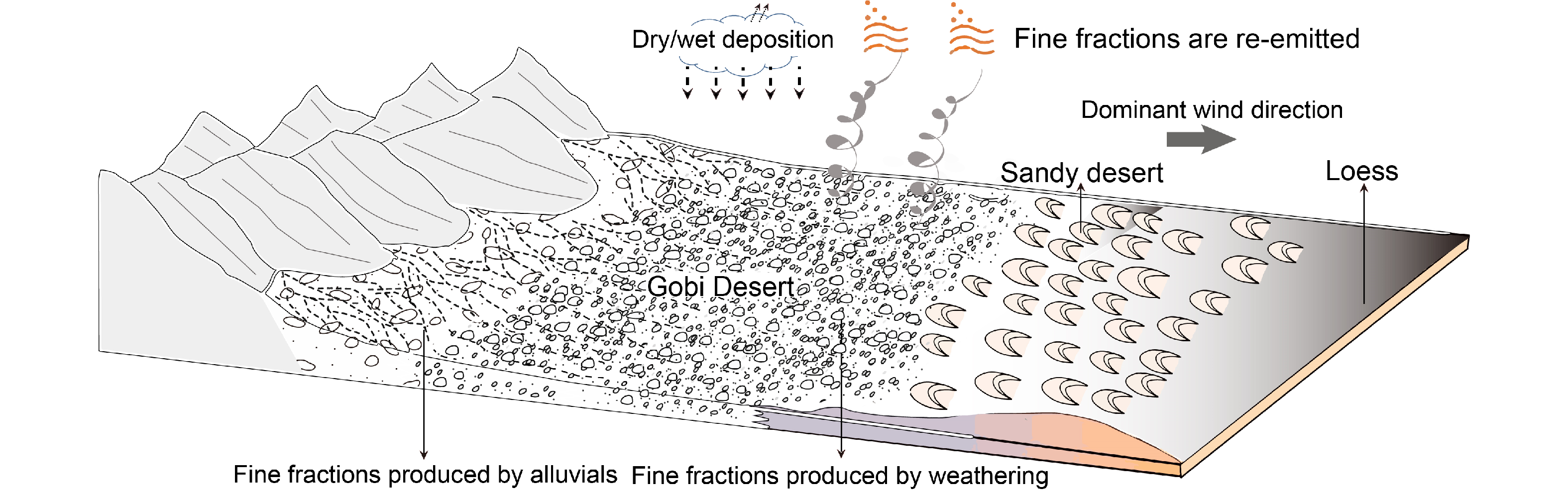 Surface soil materials from the Gobi Desert were sieved into fraction groups of 0.063–0.125, 0.125–0.25, 0.25–0.5, 0.5–1, and 1–2 mm. These samples were placed in a field for a physical weathering and dust deposition experiment. In the natural Gobi Desert environment, the dust-sized fractions (< 0.063 mm in diameter) produced by physical weathering and via dust deposition in the above groups were 1387 ± 124, 702 ± 70, 698 ± 47, 742 ± 101, and 769 ± 75 g·m−2, respectively, from 18 October 2020 to 18 December 2021. Dust deposition during the same period was 611 ± 55 g·m−2. For the same respective groups, 5.32 ± 0.76%, 0.58 ± 0.27%, 0.53 ± 0.18%, 0.80 ± 0.52%, and 0.98 ± 0.31% (by weight) of the bulk samples were weathered into dust-sized fractions during the experimental period. The physical weathering intensities were 23.95%, 14.96%, 8.90%, and 2.81% by weight for fraction groups of 2–4, 4–8, 8–16, and > 16 mm, respectively. The fine-grained materials of the gravel were more sensitive to physical weathering than coarse materials. In natural environments, the processes of dust deposition and physical weathering were key factors affecting the surface topographical equilibrium of the Gobi Desert and dust emission in Asia.