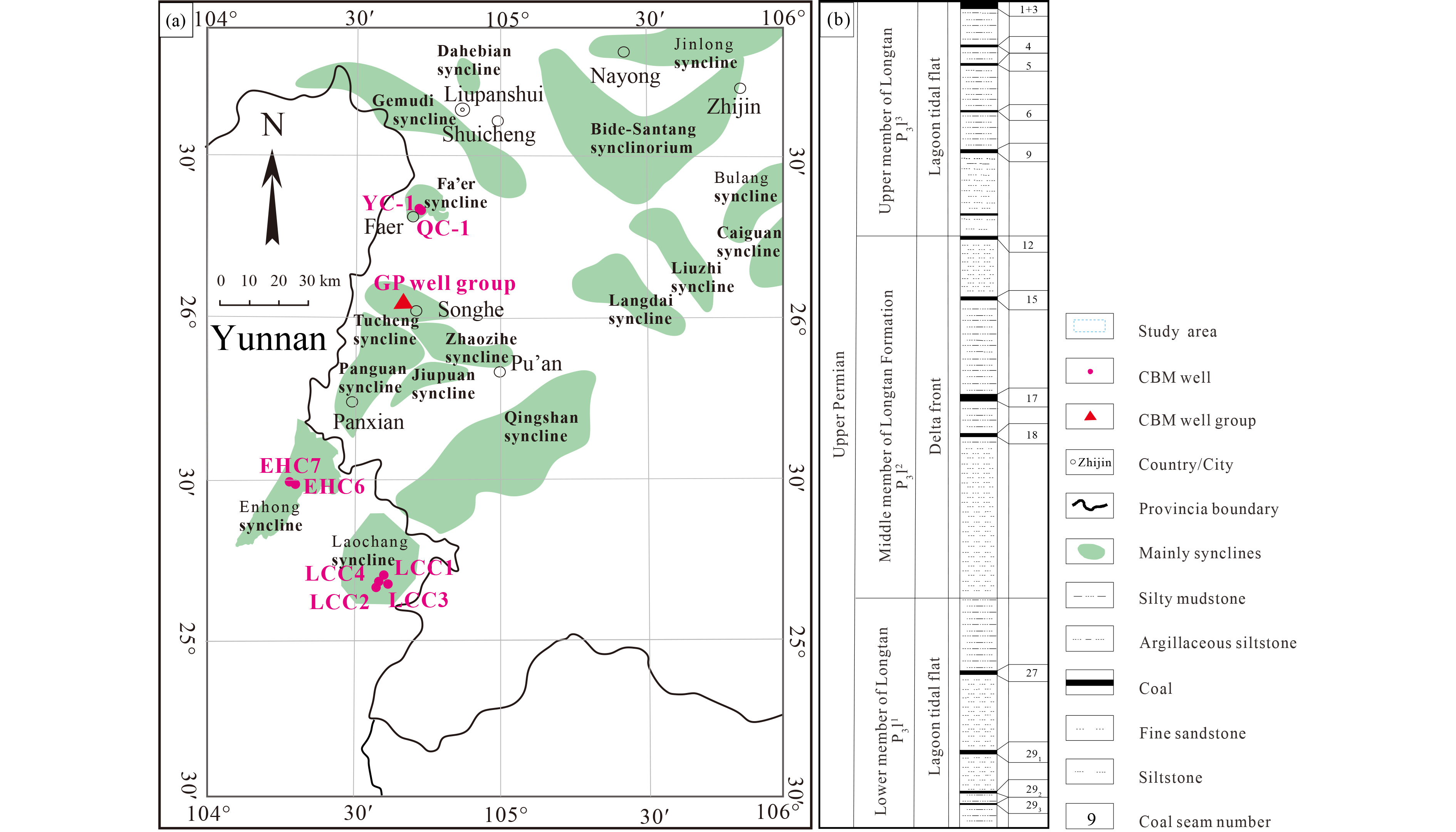 The produced water from coalbed methane (CBM) wells contains abundant geochemical and microbiological information. The microbial communities in the produced water of 14 CBM wells from four coal-bearing synclines in Guizhou and Yunnan were successfully tested by using 16S rRNA amplicon sequencing technology. The results showed that the produced water contained a large number of archaea and bacteria. The bacteria mainly included the orders Bacteroidales and Clostridiales, accounting for 37.4% and 32.92%, respectively. The water contained more than 30 species of bacteria and 15 species of methanogens. Macellibacteroides was the dominant genus, followed by the genus Citrobacter. The methanogens mainly included the orders Methanobacteriales and Methanosarcinales, accounting for 57.46% and 26.49%, respectively. Methanobacterium was the dominant genus, followed by the genus Methanothrix. There were three kinds of metabolism: hydrogenotrophic methanogens, acetoclastic methanogens, and methylotrophic methanogens. The main influencing factors of archaea were coalbed properties, such as burial depth and Ro,max, while the influencing factors of bacteria were mainly the physical and chemical properties of groundwater, including Cl−, total dissolved solids, and HCO3−. The microbial communities were segmented in the vertical direction of the coal measure strata, which can be consistent with the distribution characteristics of multiple superposed fluid systems, and the main microbial species in each section were preliminarily identified. Combining carbon and hydrogen isotopes of methane, and dissolved inorganic carbon stable carbon isotopes of produced water from CBM wells, the results showed that the microbial reduction in the Tucheng and Enhong synclines were strong and that there were obvious secondary biogases. A reduction in hydrogen-trophic methane bacteria is an important way to produce secondary biogases in the study area. These synclines are suitable to carry out microbially enhanced coalbed methane research, expanding and extending CBM stimulation technology in the later stage.