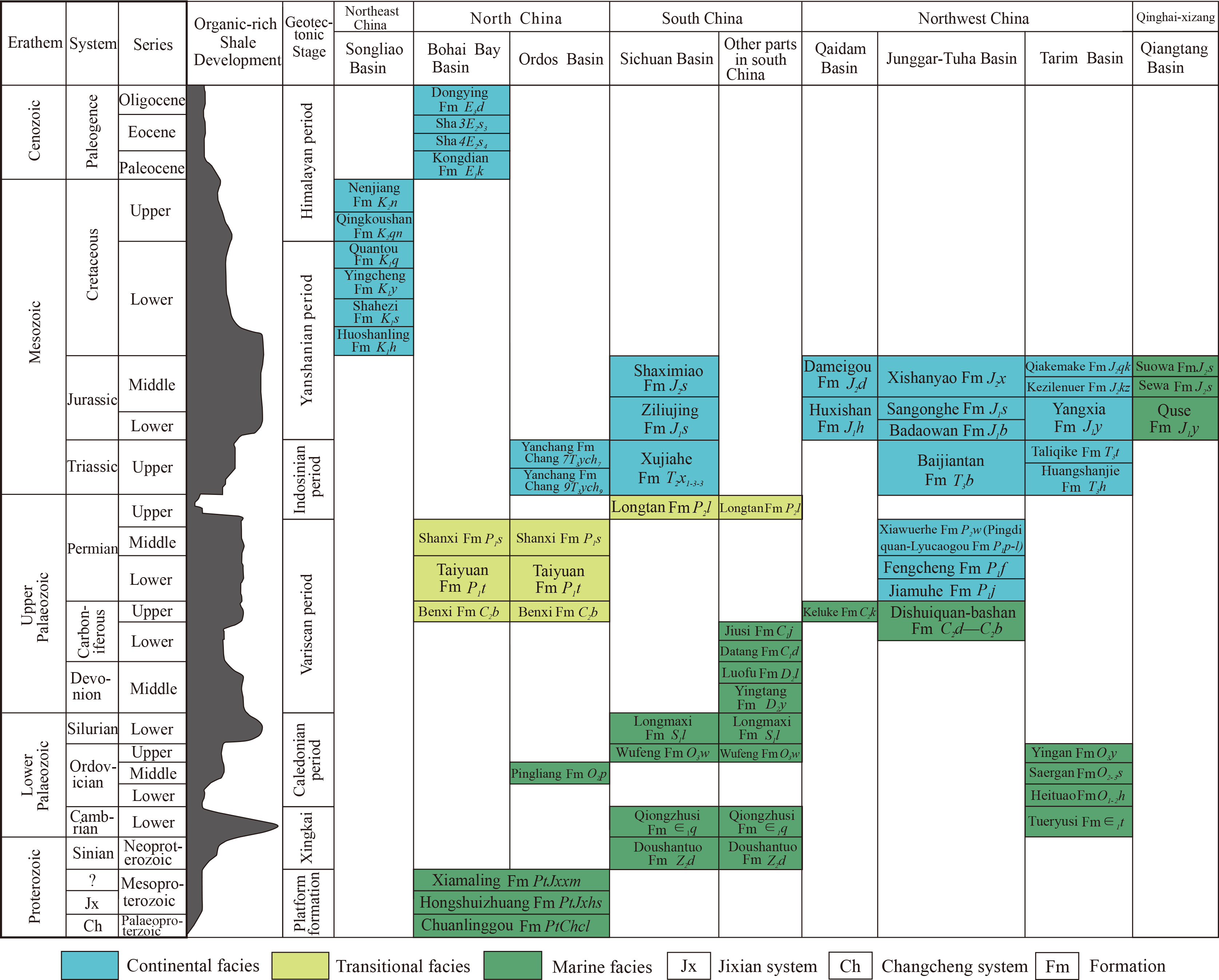 The sedimentary environment is inextricably linked to the macroscopic and microscopic characteristics of shale reservoirs, which influences shale gas accumulation significantly. This study discusses how the sedimentary environment affects the organic-matter-rich shale reservoirs that have been deposited in typical marine, marine-continental transitional, and continental basins in China. The following four aspects were analyzed including shale rock type and thickness distribution, organic matter abundance and distribution, mineral composition and pore structure, and kerogen type and hydrocarbon generation potential. From continental to marine facies, the sedimentary setting of shales with high organic content generally ranges from shore-shallow lakes to deep lakes, deltas, tidal flat lagoons, shallow sea shelves, and deep or semi-deep seas. In deeper water, the clay mineral content decreases, but the brittleness index and siliceous content increase with darker shale color. Thick shales mostly were deposited in deep or semi-deep lakes, delta fronts, prodeltas, tidal flat lagoons, and deep or semi-deep seas from continental to marine basins. The primary factors influencing organic matter enrichment in deep-sea and deep-lake shales are redox conditions and high biological productivity under favorable sedimentary environments, whereas favorable factors for organic matter enrichment in transitional facies include warm-humid palaeoclimates and abundant debris inputs. Continental shale is characterized by the presence of intergranular and intragranular pores, a low pore volume and specific surface area, and a high average pore size and hydrocarbon potential. The kerogen types are complex in continental shales, with type I in deep lake shales and type III in lakeshore shales. Transitional shales occur mostly in coal-bearing strata with type III organic content, medium pore sizes, and hydrocarbon generation potential. The high specific surface area and pore volume, small pore size, and high brittle mineral content of marine shale facilitate the production of dissolution pores. Marine shales are mainly kerogen type I–II1 with relatively high maturity and low hydrocarbon production potential. By constructing an intrinsic link between the sedimentary environment and reservoir parameters, a sedimentary model of organic-rich shale under different depositional context should be summarized in the future, which can provide a foundation to analyze the geological circumstances of shale gas accumulation.