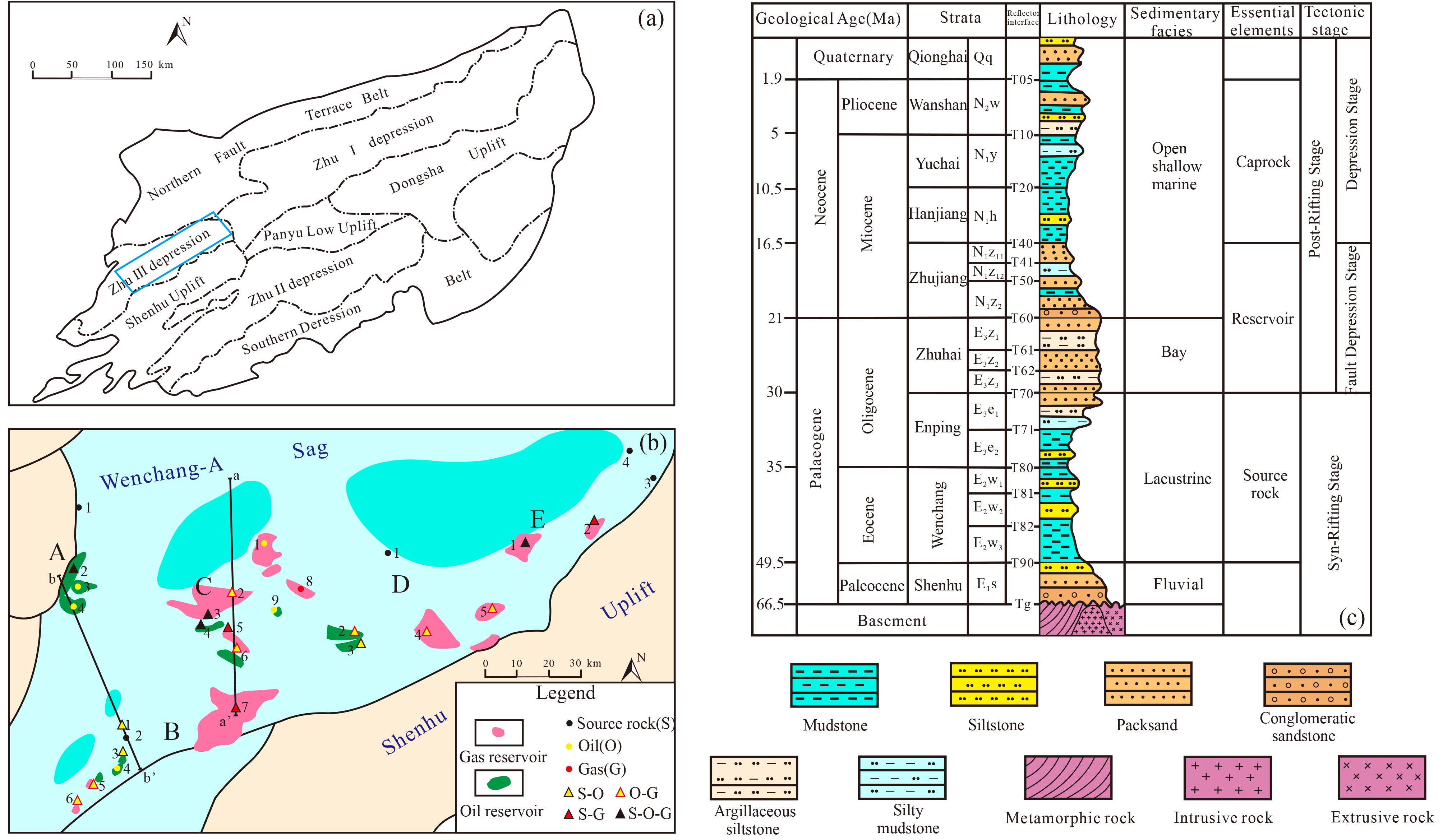 Complex hydrocarbon distributions characterize the Wenchang-A Sag. Systematic study of the geochemical characteristics of crude oil, natural gas and source rocks and their genetic relationship is still needs to be completed. The Rock-Eval, kerogen maceral, vitrinite reflectance, saturated hydrocarbon gas chromatography-mass spectrometry, natural gas components, carbon isotopes, and light hydrocarbon were performed. 1) Crude oil is classified based on four factors: wax content, the presence of C27 diasteranes, the regular steranes αα20RC27-αα20RC28-αα20RC29, and the bicadinanes characteristics. Class I crude oil has high wax and C27 diasteranes. For Class II crude oil, the regular steranes are in ‘L’- shaped distribution, and the content of bicadinanes is shallow. Class III crude oil has soft wax and C27 diasteranes, and regular steranes in the reverse ‘L’-shaped distribution, with a high peak degree of bicadinanes. For Class IV crude oil, regular steranes are in ‘V’-shaped distribution, with high peak bicadinane. 2) Class I crude oil comes from source rocks in area C. Class II crude oil comes from source rocks in areas D and E. Class III crude oil comes from areas A, and B. Class IV crude oil comes from source rocks in area A. 3) The source of natural gas in Group I is hydro propylene, and natural gas in Group II is humic. Natural gas in Group III is mixed. Groups I and II are kerogen cracking gas, and group III is a mixture of crude oil secondary cracking gas and kerogen cracking gas. Natural gas in Groups I and II mainly come from local source rocks, and Group III has mixed source characteristics. In the future, oil exploration can continue in Areas C and D, and more favorable areas for gas exploration are Areas C, D, and E.