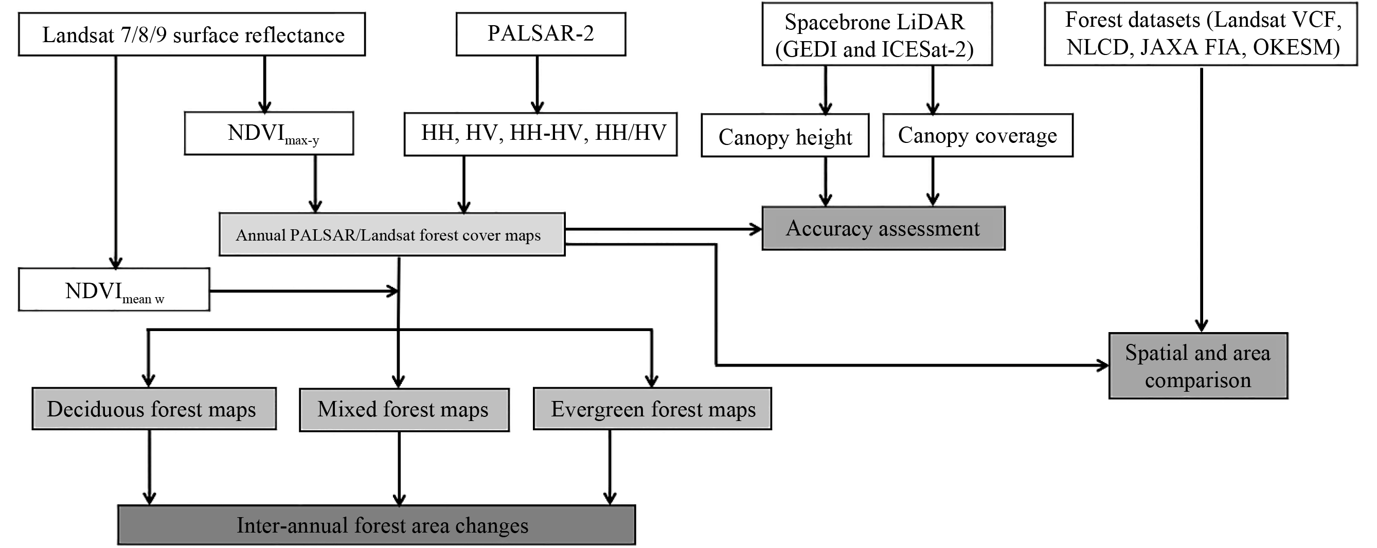 Accurate forest cover maps are the basis for estimating forest biomass and are crucial for climate regulation and biodiversity conservation, especially in sub-humid and semi-arid regions such as Oklahoma, USA. To date, there is very limited data and knowledge of the spatial pattern and temporal dynamics of forest cover in Oklahoma, and current forest cover maps have large uncertainties. In this study, multi-sensor datasets, including the Phased Arrayed L-band Synthetic Aperture Radar (PALSAR-2), Landsat, and spaceborne Light Detection and Ranging (LiDAR), were combined to generate annual forest cover maps for the years 2015 to 2021. Specifically, both PALSAR-derived HV, HH-HV, and HH/HV and Landsat-derived Normalized Difference Vegetation Index (NDVI) were used together to generate annual maps of forest cover and three forest types (evergreen, deciduous, and mixed forest) at 30-m spatial resolution for each year. The canopy height and canopy coverage samples from the Global Ecosystem Dynamics Investigation (GEDI) and the Ice, Cloud, and land Elevation Satellite-2 (ICESat-2) were used to assess forest cover maps. We also compared the spatial distribution and forested area of several forest products. Our results show that using the forest definition (canopy height > 5 m, canopy coverage > 10% over an area of 0.5 ha) of the Food and Agriculture Organization of the United Nations (FAO), the accuracy of resultant PALSAR/Landsat forest cover map for 2019 were 77.4% (GEDI) and 95.6% (ICESat-2). The estimated forested area (51,916 km2) was moderately higher (7.2%) than the forested area from the USDA Forest Inventory and Analysis (FIA) statistics dataset (48,202 km2) in 2017. Between 2016 and 2020, Oklahoma’s forested area increased slightly by 1.9%. The PALSAR/Landsat forest maps are more accurate in western Oklahoma compared to other satellite-based forest products. The resultant annual maps of forest cover and three different forest types over Oklahoma can be used to support statewide forest management and conservation.