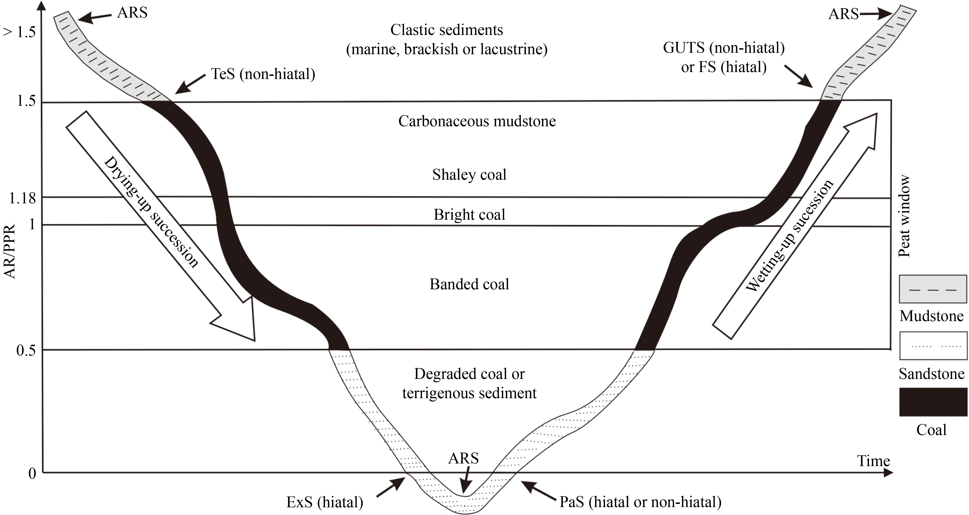 Sequence stratigraphy and coal petrology can be used to comprehensively analyze the mechanism of extremely thick coal seams under the influence of the paleo-climate, paleo-environment, and accommodation space during a coal-forming period. Based on the vertical variations in coal quality, macerals, and lithology, key sequence surfaces were identified, including the terrestrialization surface (TeS), paludification surface (PaS), give-up transgressive surface (GUTS), accom-modation reversal surface (ARS), exposure surface (ExS), and flooding surface (FS) in thick coal seams of the Middle Jurassic Dameigou Formation in the Saishiteng Coalfield, northern Qaidam Basin. Using these key sequence surfaces, thick terrestrial coal seams can be divided into several wetting-up and drying-up cycles. In general, the vitrinite content, vitrinite/inertinite ratio (V/I), and gelification index (GI) increased from bottom to top, whereas the inertinite content decreased in the wetting-up cycles. The vertical stacking pattern considers the PaS as the bottom boundary, and the GUTS or ARS as the top boundary, representing an increasing trend in the accommodation space. However, the vitrinite content, V/I, and GI values decreased from the bottom to the top, whereas the inertinite content increased during the drying-up cycle. Another vertical stacking pattern started from the TeS, with the ExS or ARS as the top boundary, representing a decreasing trend in the accommodation space. The thick coal seams at the edge of the Saishiteng Coalfield are blocked by a large number of clastic sediments, whereas relatively few clastic sediments are found in the coalfield center; thus, a single extremely thick coal seam with good continuity can be formed. Based on the coal petrology and sequence stratigraphic analyses, a model of extremely thick coal seams superimposed on multiple peatlands was established from the basin margin to the basin center. Four to five drying-up and wetting-up cycles were predicted in accumulation variation. During a water transgression stage, new peat accumulates on the land, corresponding to a wetting-up cycle. In a water regression stage, new peat accumulates in the basin center, corresponding to a drying-up cycle. Analysis of the genesis of thick coal seams is important for the in-depth excavation of geological information during the coal-forming period and for coal resource exploration in terrestrial basins.