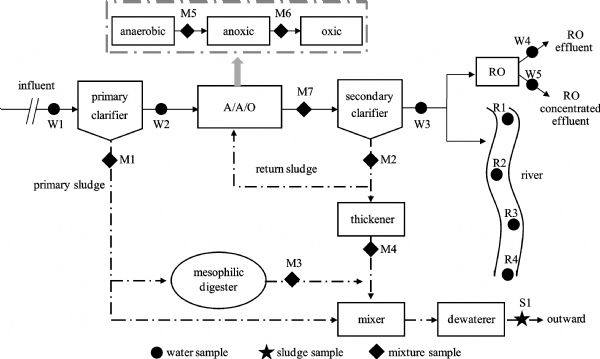 The fate and removal of pharmaceuticals and personal care products (PPCPs) in wastewater treatment plants (WWTPs) has received great attention during the last decade. Numerous data concerning concentrations in the water phase can be found in the literature, however corresponding data from sludge as well as associated mass balance calculations are very limited. In the present study, the adsorbed and dissolved concentrations of 9 PPCPs were investigated in each unit of a WWTP in Beijing, China. Based on the calculation of mass balance, the relative mass distribution and removal efficiency of each target compound was obtained at each process. The amount of PPCPs entering into the WWTP ranged from 12 g·d−1 to 3848 g·d−1. Five target compounds (caffeine, chloramphenicol, bezafibrate, clofibric acid, and N,N-diethyl-meta-toluamide) were effectively removed, with rates of 57%–100%. Negative removal efficiencies were obtained for sulpiride, metoprolol, nalidixic acid, and carbamazepine, ranging from -19% to -79%. PPCPs mainly existed in dissolved form (≥92%) in both the raw influent and the final effluent. The sludge cake carried a much lower amount of PPCPs (17 g·d−1) compared with the discharged effluent (402 g·d−1). In A2/O treatment tanks, the anaerobic and anoxic tanks showed good performance for PPCPs removal, and the amount of adsorbed PPCPs was increased. The results reveal that both the dissolved and the adsorbed phases should be considered when assessing the removal capacity of each A2/O tank.