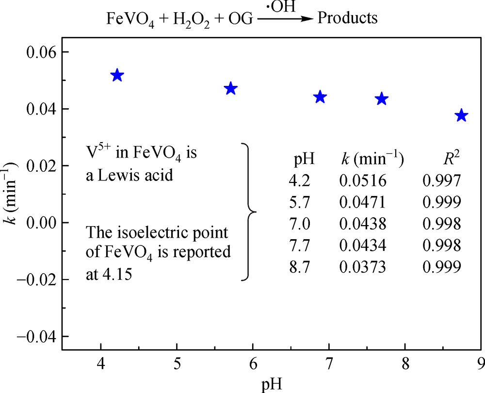 The applicability of FeVO4 extended the optimum pH range for heterogeneous Fenton process towardsneutral conditions. The datas for the removal of OG in FeVO4 systems conform to the Langmuir–Hinshelwood model. The irradiation of FeVO4 by visible light significantly increases the degradation rate ofOG due to the enhanced rates of the iron and vanadium cycles.