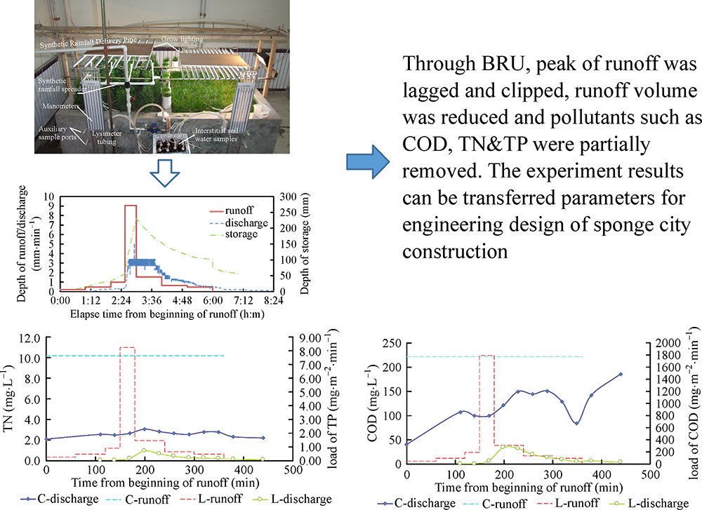 Peak of surface runoff was lagged andclipped by BRU with turf grass and B. Sinica. Lag of peak and extent of clipping wasinfluenced flow regime of inflow and plants grown. TN, TP and COD were removed by filtrationof the media and bio-degradation of reservoir layer. Infiltration rate and storage depth couldbe transferred key parameters for engineering design.