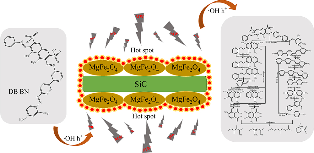The adsorption behavior of DB BN on microwave catalyst MgFe2O4-SiC was investigated and the effects of concentration, temperature and pH on the adsorption process were discussed in this study. The microwave-induced catalytic degradation rate of DB BN decreased even more than ten percent after the adsorption equilibrium were attained. The degradation intermediate products of DB BN were identified and analyzed by GC-MS and LC-MS. The proposed degradation pathways of direct black BN (DB BN) were described by combining with the microwave-induced catalytic reaction mechanism of MgFe2O4-SiC.