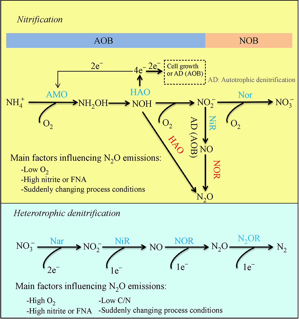 N2O release variesin response to enzyme-catalyzed nitrogen imbalances. The enzymology involved in N2O production and consumption are introduced. The pathways of N2O production and consumption are summarized. Key factors affecting N2O release and enzymatic mechanisms are summarized/revealed. Enzymatic strategies are proposed tomitigate N2O emissions.