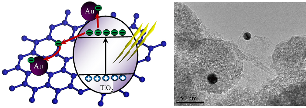 Deposition Au nanoparticles on both TiO2 and RGO to fabricate Au/TiO2/RGO. Au/TiO2/RGO displayed a high H2O2 and •OH production in photocatalytic process. RGO is a good collector to transfer electrons from TiO2 to Au.