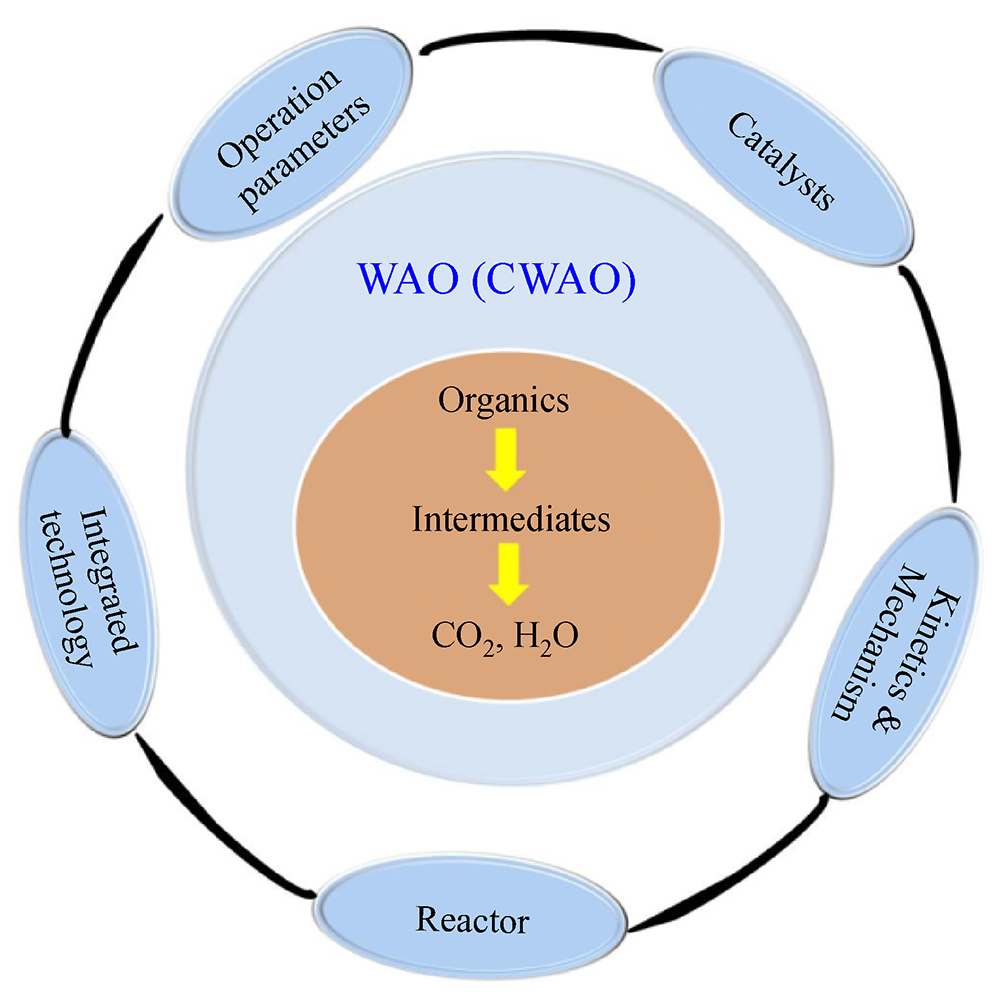 Different reaction parameters are emphasized in the WAO process. Homogenous catalysts and heterogeneous catalysts are extensively discussed. Mechanism and kinetic of WAO are elaborated. Three kinds of the reactors for CWAO are compared. Integration of CWAO with biological degradation is discussed.