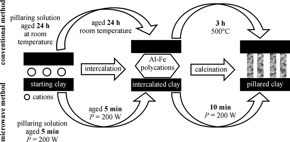 Microwave irradiation has been used to prepare Al, Fe-pillared clays from a natural Tunisian smectite from the El Hicha deposit (province of Gabes). Chemical analysis, XRD spectra and surface properties evidenced the success of pillaring process. The obtained solids present higher surface area and pore volume than conventionally prepared Al-Fe pillared clays. The main advantages of the microwave methodology are the considerable reduction of the synthesis time and the consumption of water. The microwave-derived Al-Fe pillared clays have been tested for catalytic wet air oxidation (CWAO) of phenol in a stirred tank at 160°C and 20 bar of pure oxygen pressure. These materials are efficient for CWAO of phenol and are highly stable despite the severe operating conditions (acidic media, high pressure, high temperature). The catalyst deactivation was also significantly hindered when compared to conventionally prepared clays. Al-Fe pillared clays prepared by microwave methodology are promising as catalysts for CWAO industrial water treatment.