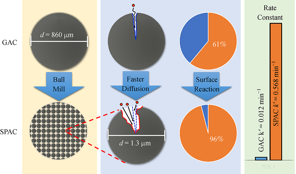 SPAC significantly enhanced the efficacyof catalytic ozonation. Large external surface reduced the diffusionresistance. Surface reaction was dominant for SPAC-basedcatalytic ozonation. Simple ball milling brought favorablematerial characteristics for catalysis.
