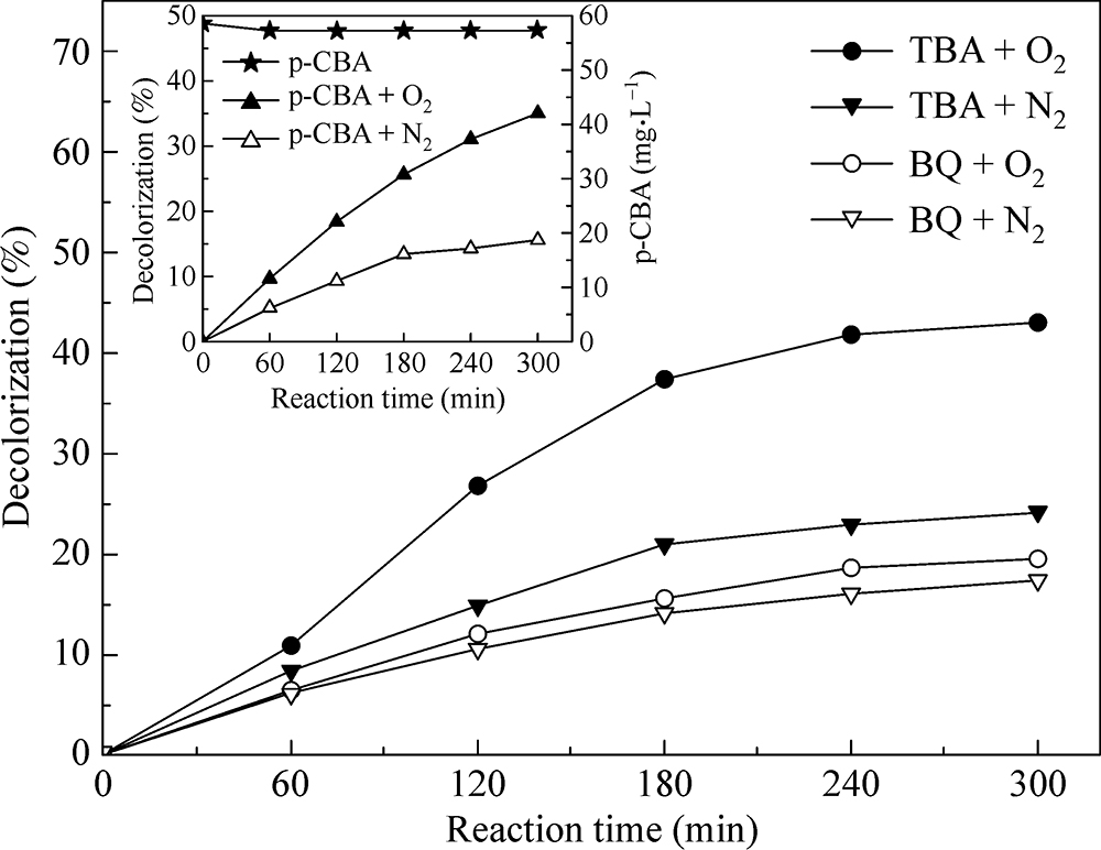 The Fe2O3-CeO2-Bi2O3/γ-Al2O3 catalyst, a novel environmental-friendly material, was used to investigate the catalytic wet air oxidation (CWAO) of cationic red GTL under mild operating conditions in a batch reactor. The catalyst was prepared by wet impregnation, and characterized by special surface area (BET measurement), X-ray diffraction (XRD) and X-ray photoelectron spectroscopy (XPS). The Fe2O3-CeO2-Bi2O3/γ-Al2O3 catalyst exhibited good catalytic activity and stability in the CWAO under atmosphere pressure. The effect of the reaction conditions (catalyst loading, degradation temperature, solution concentration and initial solution pH value) was studied. The result showed that the decolorization efficiency of cationic red GTL was improved with increasing the initial solution pH value and the degradation temperature. The apparent activation energy for the reaction was 79 kJ·mol−1. Hydroperoxy radicals (HO2·) and superoxide radicals (O2−·) appeared as the main reactive species upon the CWAO of cationic red GTL.