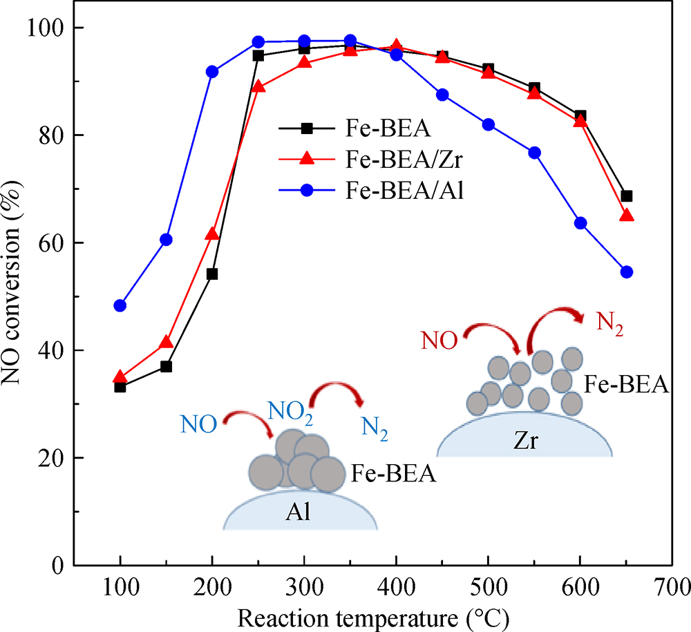 Fe-BEA with zirconia binder has higher SCR activity in high temperature. Alumina enhances the low-temperature activity for greater NO oxidation and storage. The SCR activity of Fe-BEA/Al decreases in high temperature.