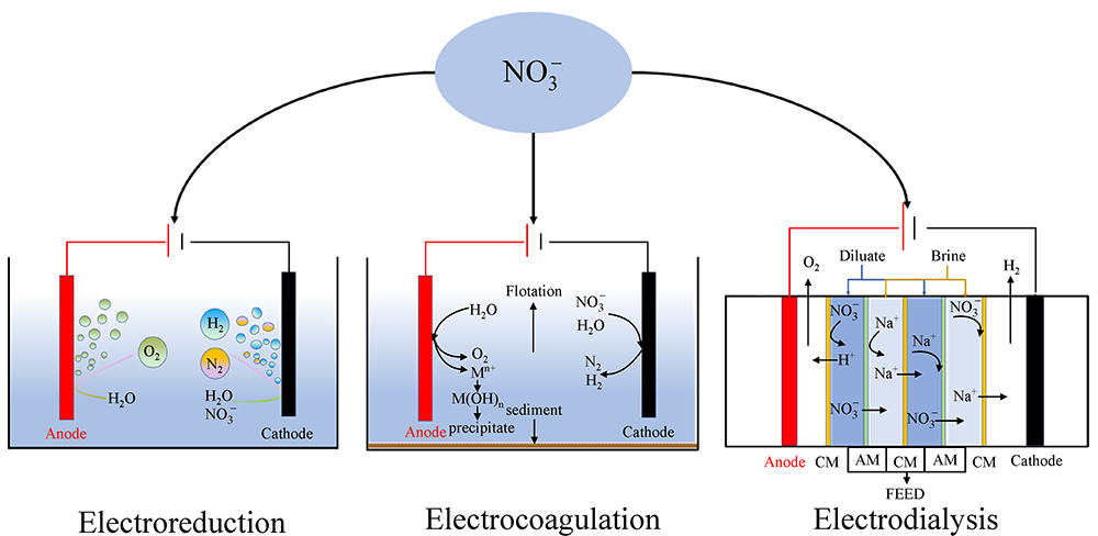 A number of recent studies have demonstrated that electrochemical technologies, including electroreduction (ER), electrocoagulation (EC), and electrodialysis (ED), are effective in nitrate elimination in wastewater due to their high reactivity. To obtain the maximal elimination efficiency and current efficiency, many researchers have conducted experiments to investigate the optimal conditions (i.e., potential, current density, pH value, plate distance, initial nitrate concentration, electrolyte, and other factors) for nitrate elimination. The mechanism of ER, EC and ED for nitrate removal has been fully elucidated. The ER mechanism of nitrate undergoes electron transfer and hydrogenation reduction. The EC pathways of nitrate removal include reduction, coagulation and flotation. The ED pathways of nitrate include redox reaction and dialysis. Although the electrochemical technology can remove nitrate from wastewater efficiently, many problems (such as relatively low selectivity toward nitrogen, sludge production and brine generation) still hinder electrochemical treatment implementation. This paper critically presents an overview of the current state-of-the-art of electrochemical denitrification to enhance the removal efficiency and overcome the shortages, and will significantly improve the understanding of the detailed processes and mechanisms of nitrate removal by electrochemical treatment and provide useful information to scientific research and actual practice.
