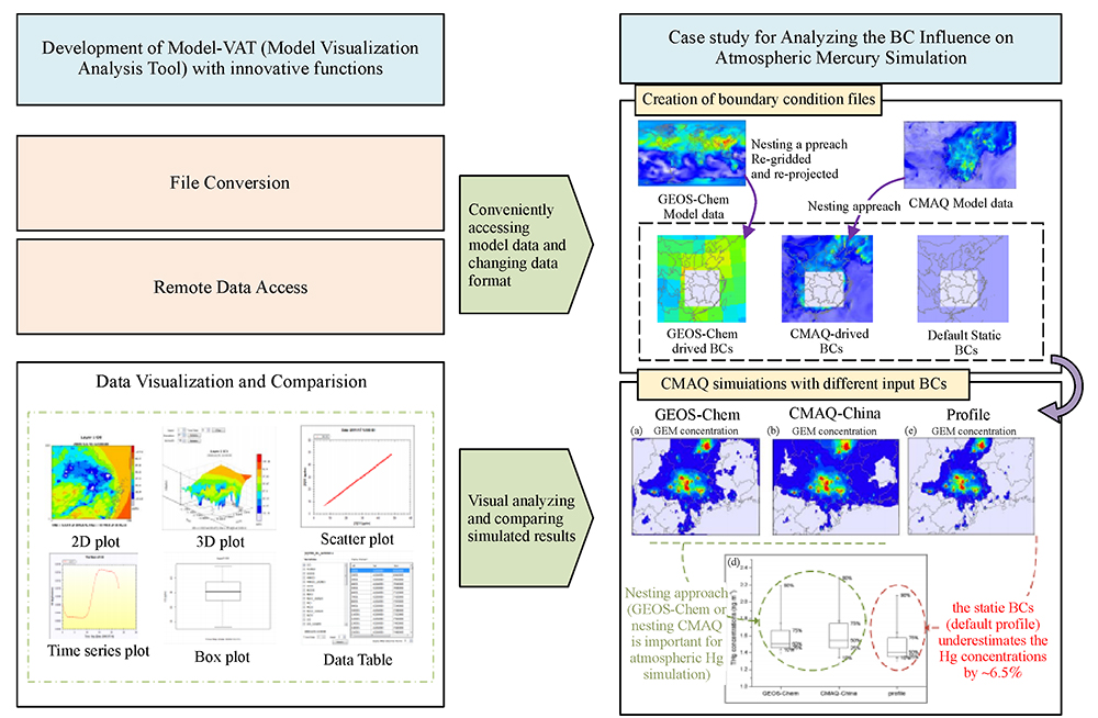Atmospheric models are essential tools to study the behaviorof air pollutants. To interpret the complicated atmospheric modelsimulations, a new-generation Model Visualization and Analysis Tool(Model-VAT) has been developed for scientists to analyze the modeldata and visualize the simulation results. The Model-VAT incorporatesanalytic functions of conventional tools and enhanced capabilitiesin flexibly accessing, analyzing, and comparing simulated resultsfrom multi-scale models with different map projections and grid resolutions.The performance of the Model-VAT is demonstrated by a case study ofinvestigating the influence of boundary conditions (BCs) on the ambientHg formation and transport simulated by the CMAQ model over the PearlRiver Delta (PRD) region. The alternative BC options are taken from(1) default time-independent profiles, (2) outputs from a CMAQ simulationof a larger nesting domain, and (3) concentration files from GEOS-Chem(re-gridded and re-projected using the Model-VAT). The three BC inputsand simulated ambient concentrations and deposition were comparedusing the Model-VAT. The results show that the model simulations basedon the static BCs (default profile) underestimates the Hg concentrationsby ~6.5%, dry depositions by ~9.4%, and wet depositions by ~43.2%compared to those of the model-derived (e.g. GEOS-Chem or nestingCMAQ) BCs. This study highlights the importance of model nesting approachand demonstrates that the innovative functions of Model-VAT enhancesthe efficiency of analyzing and comparing the model results from variousatmospheric model simulations.
