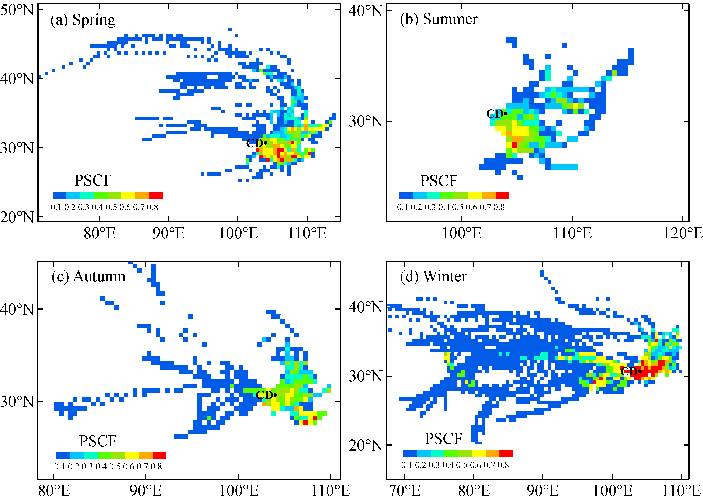 Seasonal pattern of transport pathways and potential sources of PM2.5 in Chengdu during 2012–2013 were investigated based on hourly PM2.5 data, backward trajectories, clustering analysis, potential source contribution function (PSCF), and concentration-weighted trajectory (CWT) method. The annual hourly mean PM2.5 concentration in Chengdu was 97.4 mg·m–3. 5, 5, 5 and 3 mean clusters were generated in four seasons, respectively. Short-distance air masses, which travelled within the Sichuan Basin with no specific source direction and relatively high PM2.5 loadings (>80 mg·m–3) appeared as important pathways in all seasons. These short pathways indicated that emissions from both local and surrounding regions of Chengdu contributed significantly to PM2.5 pollution. The cities in southern Chengdu were major potential sources with PSCF>0.6 and CWT>90 mg·m–3. The northeastern pathway prevailed throughout the year with higher frequency in autumn and winter and lower frequency in spring and summer. In spring, long-range transport from southern Xinjiang was a representative dust invasion path to Chengdu, and the CWT values along the path were 30-60 mg·m–3. Long-range transport was also observed in autumn from southeastern Xinjiang along a northwesterly pathway, and in winter from the Tibetan Plateau along a westerly pathway. In summer, the potential source regions of Chengdu were smaller than those in other seasons, and no long-range transport pathway was observed. Results of PSCF and CWT indicated that regions in Qinghai and Tibet contributed to PM2.5 pollution in Chengdu as well, and their CWT values increased to above 30 mg·m-3 in winter.