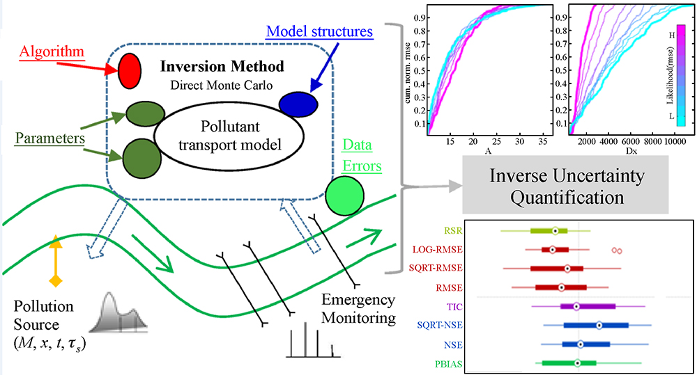 Identifying source information after river chemical spill occurrences is critical for emergency responses. However, the inverse uncertainty characteristics of this kind of pollution source inversion problem have not yet been clearly elucidated. To fill this gap, stochastic analysis approaches, including a regional sensitivity analysis method (RSA), identifiability plot and perturbation methods, were employed to conduct an empirical investigation on generic inverse uncertainty characteristics under a well-accepted uncertainty analysis framework. Case studies based on field tracer experiments and synthetic numerical tracer experiments revealed several new rules. For example, the release load can be most easily inverted, and the source location is responsible for the largest uncertainty among the source parameters. The diffusion and convection processes are more sensitive than the dilution and pollutant attenuation processes to the optimization of objective functions in terms of structural uncertainty. The differences among the different objective functions are smaller for instantaneous release than for continuous release cases. Small monitoring errors affect the inversion results only slightly, which can be ignored in practice. Interestingly, the estimated values of the release location and time negatively deviate from the real values, and the extent is positively correlated with the relative size of the mixing zone to the objective river reach. These new findings improve decision making in emergency responses to sudden water pollution and guide the monitoring network design.
