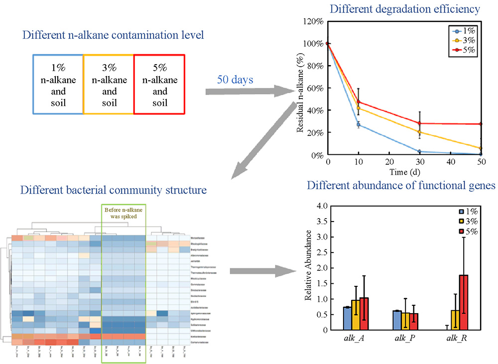 Soil microbial community is not significantly shaped by alkane concentrations Alkane concentrations alter dominant alkane degraders in soils Different alkanes are preferentially degraded at different contamination level Different types of alkane monooxygenase genes responsible for alkane degradation