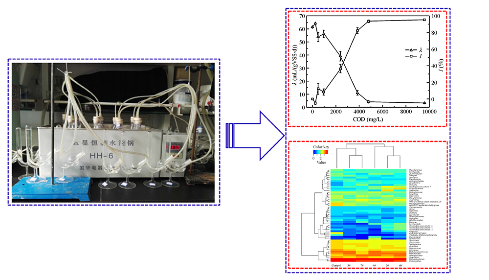 The inhibition ratio sharply increased with the increasing COD. The absorbance of UV-vis at 420 nm showed a linear correlation with the SMA. The molecular structure of EPS has changed when COD was 9585 mg/L. Illumina Miseq sequencing was employed to reveal the microbial composition.
