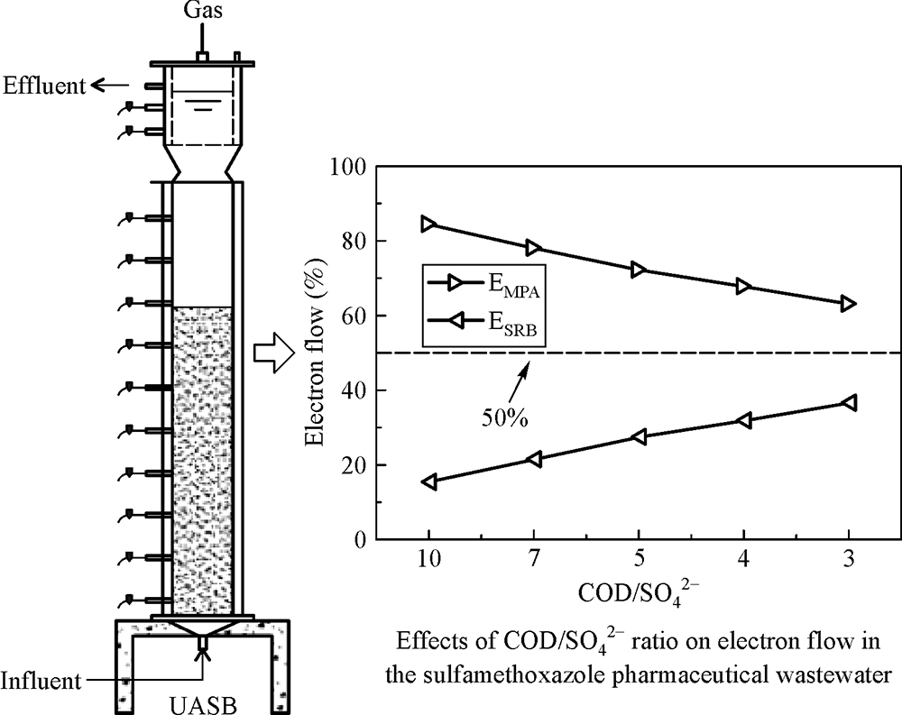 Treatment of sulfamethoxazole pharmaceutical wastewater is a big challenge. In this study, a series of anaerobic evaluation tests on pharmaceutical wastewater from different operating units was conducted to evaluate the feasibility of using anaerobic digestion, and the results indicated that the key refractory factor for anaerobic treatment of this wastewater was the high sulfate concentration. A laboratory-scale up-flow anaerobic sludge blanket (UASB) reactor was operated for 195 days to investigate the effects of the influent chemical oxygen demand (COD), organic loading rate (OLR), and COD/SO42‒ ratio on the biodegradation of sulfamethoxazole in pharmaceutical wastewater and the process performance. The electron flow indicated that methanogenesis was still the dominant reaction although sulfidogenesis was enhanced with a stepwise decrease in the influent COD/SO42‒ ratio. For the treated sulfamethoxazole pharmaceutical wastewater, a COD of 4983 mg/L (diluted by 50%), OLR of 2.5 kg COD/(m3·d), and COD/SO42‒ ratio of more than 5 were suitable for practical applications. The recovery performance indicated that the system could resume operation quickly even if production was halted for a few days.