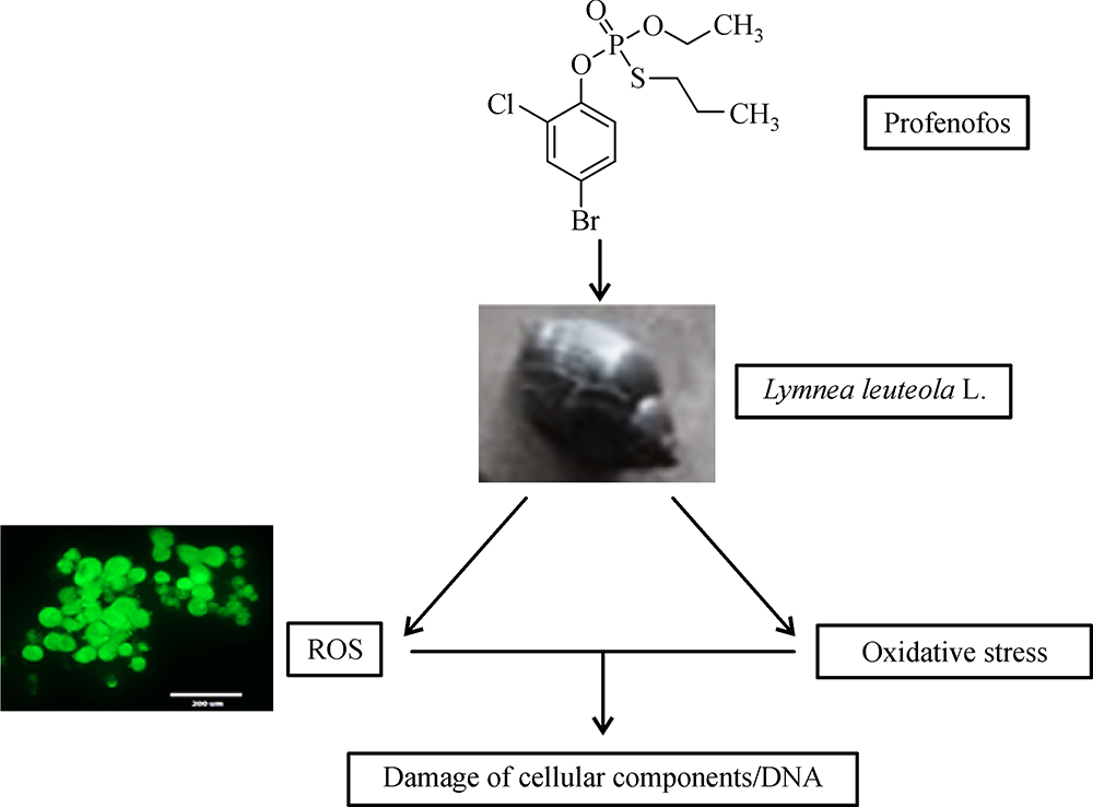 Extensive production and use of organophosphate pesticide in agriculture, has risen concerned about its ecotoxicity and risk assessment of insecticides, which are more important. Therefore, the present investigation was aimed to study the induction of oxidative stress and DNA damage by organophosphate insecticide profenofos (PFF) in freshwater snail Lymnea luteola (L. luteola). The median lethal value (96 h LC50) of PFF was estimated as 1.26 mg/L for L. luteola in a semi-static system and on the basis of LC50 value three concentrations viz., 0.126 (1/10 of LC50, Sublethal I), 0.63 (1/2 of LC50, Sublethal II) and 0.84 mg/L (2/3 of LC50, Sublethal III) were determined. Snails were exposed to above-mentioned concentrations of PFF along with solvent control (acetone) and negative control for 96 h. The haemolymph was collected at 24 and 96 h of after treatment. In heamolymph of PFF exposed snail, lipid peroxide, glutathione reduced glutathione S transferase and superoxide dismutase activities at the tested concentrations significantly differ from those in the control. The genotoxicity induced in hemocytes of treated snails was measured by alkaline single cell gel electrophoresis assay. The data of this experiment demonstrated significantly enhancement of oxidative stress and DNA damage in the treated snails as compared to controls. Also, we observed statistically significant correlations of ROS with DNA damage (% tail DNA) (R2 = 0.9708) for 24 h and DNA damage (R2 = 0.9665) for 96 h.