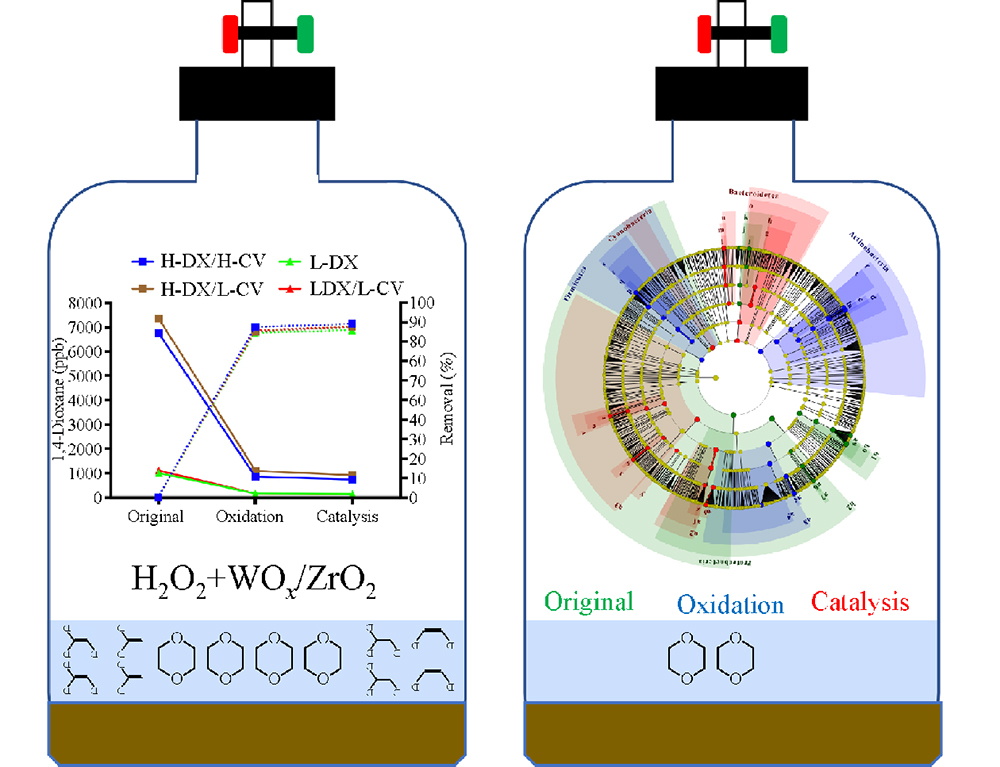 Post-treatment impacts of a novel combined hydrogen peroxide (H2O2) oxidation and WOx/ZrO2 catalysis used for the removal of 1,4-dioxane and chlorinated volatile organic compound (CVOC) contaminants were investigated in soil and groundwater microbial community. This treatment train removed ~90% 1,4-dioxane regardless of initial concentrations of 1,4-dioxane and CVOCs. The Illumina Miseq platform and bioinformatics were used to study the changes to microbial community structure. This approach determined that dynamic shifts of microbiomes were associated with conditions specific to treatments as well as 1,4-dioxane and CVOCs mixtures. The biodiversity was observed to decrease only after oxidation under conditions that included high levels of 1,4-dioxane and CVOCs, but increased when 1,4-dioxane was present without CVOCs. WOx/ZrO2 catalysis reduced biodiversity across all conditions. Taxonomic classification demonstrated oxidative tolerance for members of the genera Massilia and Rhodococcus, while catalyst tolerance was observed for members of the genera Sphingomonas and Devosia. Linear discriminant analysis effect size was a useful statistical tool to highlight representative microbes, while the multidimensional analysis elucidated the separation of microbiomes under the low 1,4-dioxane-only condition from all other conditions containing CVOCs, as well as the differences of microbial population among original, post-oxidation, and post-catalysis states. The results of this study enhance our understanding of microbial community responses to a promising chemical treatment train, and the metagenomic analysis will help practitioners predict the microbial community status during the post-treatment period, which may have consequences for long-term management strategies that include additional biodegradation treatment or natural attenuation.