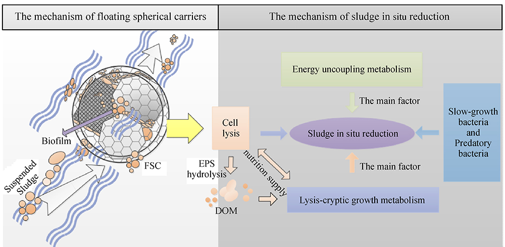 Microbial metabolism uncoupling, sludge decay is the main mechanism to promote in situ sludge reduction on this biofilm system. The main reduction mechanism inside the biofilm is sludge decay in the longitudinal distribution of biofilm. Mizugakiibacter and Azospira anaerobic fermentation bacterium dominate the FSC organisms indicating the dominant mechanism on the biofilm is sludge decay. The floating spherical carriers with compound of the polyurethane and two fiber balls can effectively blocking suspended sludge, improving Biofilm formation efficiency significantly.