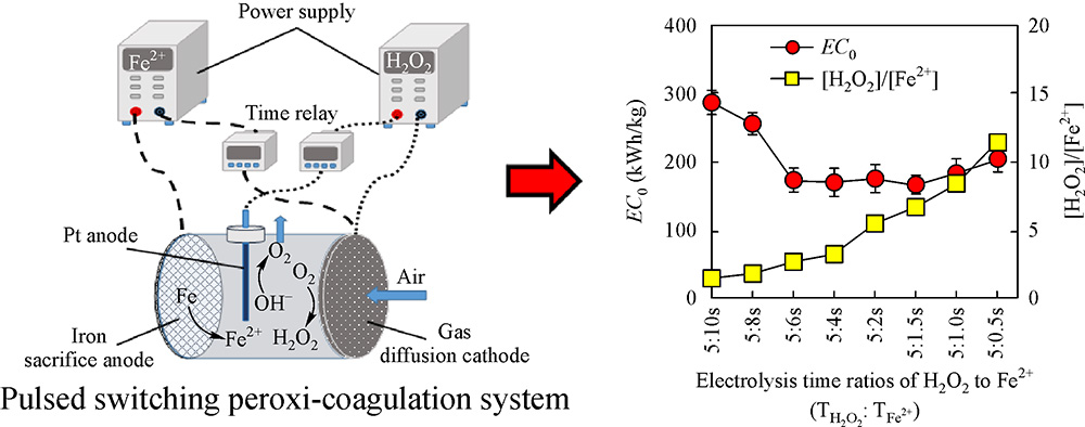 The aim of this study was to develop a new pulsed switching peroxi-coagulation system to control hydroxyl radical (∙OH) production and to enhance 2,4-Dichlorophenoxyacetic acid (2,4-D) degradation. The system was constructed with a sacrifice iron anode, a Pt anode, and a gas diffusion cathode. Production of H2O2 and Fe2+ was controlled separately by time delayers with different pulsed switching frequencies. Under current densities of 5.0 mA/cm2 (H2O2) and 0.5 mA/cm2 (Fe2+), the ∙OH production was optimized with the pulsed switching frequency of 1.0 s (H2O2):0.3 s (Fe2+) and the ratio of H2O2 to Fe2+ molar concentrations of 6.6. Under the optimal condition, 2,4-D with an initial concentration of 500 mg/L was completely removed in the system within 240 min. The energy consumption for the 2,4-D removal in the system was much lower than that in the electro-Fenton process (68±6 vs. 136±10 kWh/kg TOC). The iron consumption in the system was ~20 times as low as that in the peroxi-coagulation process (196±20 vs. 3940±400 mg/L) within 240 min. The system should be a promising peroxi-coagulation method for organic pollutants removal in wastewater.