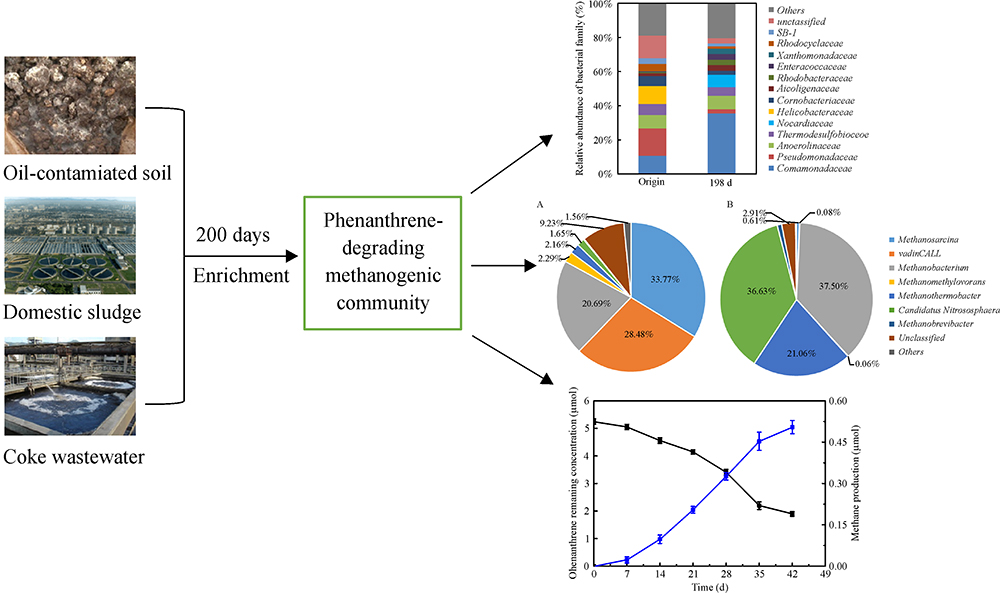 The mixed samples of contaminated soil, sludge and coke wastewater showed great phenanthrene methanogenic degradation potential. Comamonadaceae, Nocardiaceae and Methanobacterium were dominant members. Hexane, hexadecane and benzene could enhance phenanthrene degradation.