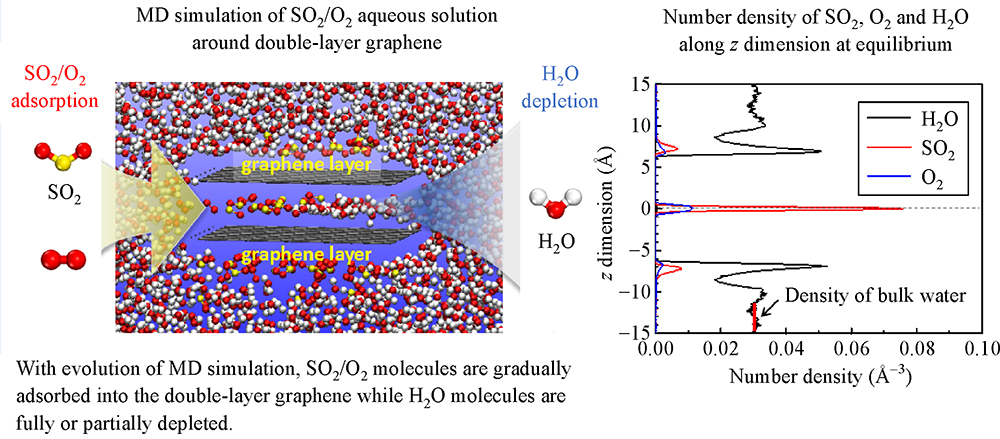 Porous carbon material facilitates the reaction SO2 + O2 + H2O → H2SO4 in coal-burned flue gas for sulfur resources recovery at mild conditions. It draws a long-term mystery on its heterogeneous catalysis due to the complicated synergic effect between its microstructure and chemical components. To decouple the effects of geometric structure from chemical components, classical molecular dynamics method was used to investigate the static and dynamic characteristics of the reactants (H2O, SO2 and O2) in the confined space truncated by double-layer graphene (DLG). Strong adsorption of SO2 and O2 by the DLG was observed, which results in the filling of the solute molecules into the interior of the DLG and the depletion of H2O. This effect mainly results from the different affinity of the DLG to the species and can be tuned by the separation of the two graphene layers. Such dimension dependence of the static and dynamic properties like distribution profile, molecular cluster, hydrogen bond and diffusion coefficient were also studied. The conclusions drawn in this work could be helpful to the further understanding of the underlying reaction mechanism of desulfurization process in porous carbon materials and other applications of carbon-based catalysts.