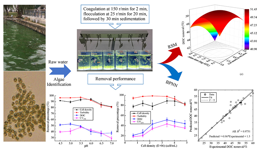 Seasonal algal blooms of Lake Yangcheng highlight the necessity to develop an effective and optimal water treatment process to enhance the removal of algae and dissolved organic matter (DOM). In the present study, the coagulation performance for the removal of algae, turbidity, dissolved organic carbon (DOC) and ultraviolet absorbance at 254 nm (UV254) was investigated systematically by central composite design (CCD) using response surface methodology (RSM). The regression models were developed to illustrate the relationships between coagulation performance and experimental variables. Analysis of variance (ANOVA) was performed to test the significance of the response surface models. It can be concluded that the major mechanisms of coagulation to remove algae and DOM were charge neutralization and sweep flocculation at a pH range of 4.66–6.34. The optimal coagulation conditions with coagulant dosage of 7.57 mg Al/L, pH of 5.42 and initial algal cell density of 3.83 × 106 cell/mL led to removal of 96.76%, 97.64%, 40.23% and 30.12% in term of cell density, turbidity, DOC and UV254 absorbance, respectively, which were in good agreement with the validation experimental results. A comparison between the modeling results derived through both ANOVA and artificial neural networks (ANN) based on experimental data showed a high correlation coefficient, which indicated that the models were significant and fitted well with experimental results. The results proposed a valuable reference for the treatment of algae-laden surface water in practical application by the optimal coagulation-flocculation process.