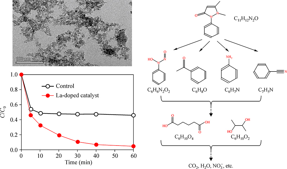 A La-doped Co-Cu-Fe catalyst was synthesized for the antipyrine (ANT) removal. The La-doped catalyst had higher ANT removal than the control (95% vs. 54%). La reduced the particle size and increased the specific surface area of catalyst.