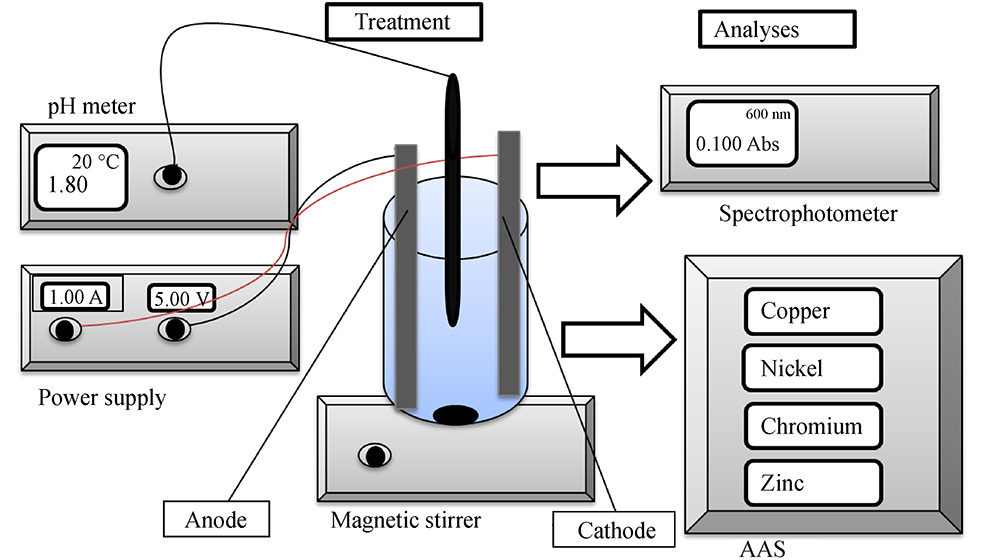 It is known that wastewater produced by the metal-plating industry contains several heavy metals, which are acidic in nature and therefore toxic for the environment and for living creatures. In particular, heavy metals enter the food chain and accumulate in vital organs and cause serious illness. The precipitation of these metals is mostly achieved by pH adjustment, but as an alternative to this method, the electrocoagulation process has investigated in this study using iron and aluminum electrodes. The effects of the pH adjustment on removal before and after the electrocoagulation process were investigated, and cost analyses were also compared. It was observed that a high proportion of removal was obtained during the first minutes of the electrocoagulation process; thus, the current density did not have a great effect. In addition, the pH adjustment after the electrocoagulation process using iron electrodes, which are 10% more effective than aluminum electrodes, was found to be much more efficient than before the electrocoagulation process. In the process where kinetic modeling was applied, it was observed that the heavy metal removal mechanism was not solely due to the collapse of heavy metals at high pH values, and with this modeling, it was seen that this mechanism involved adsorption by iron and aluminum hydroxides formed during the electrocoagulation process. When comparing the ability of heavy metals to be adsorbed, the sequence was observed to be Cr>Cu>Ni>Zn, respectively.