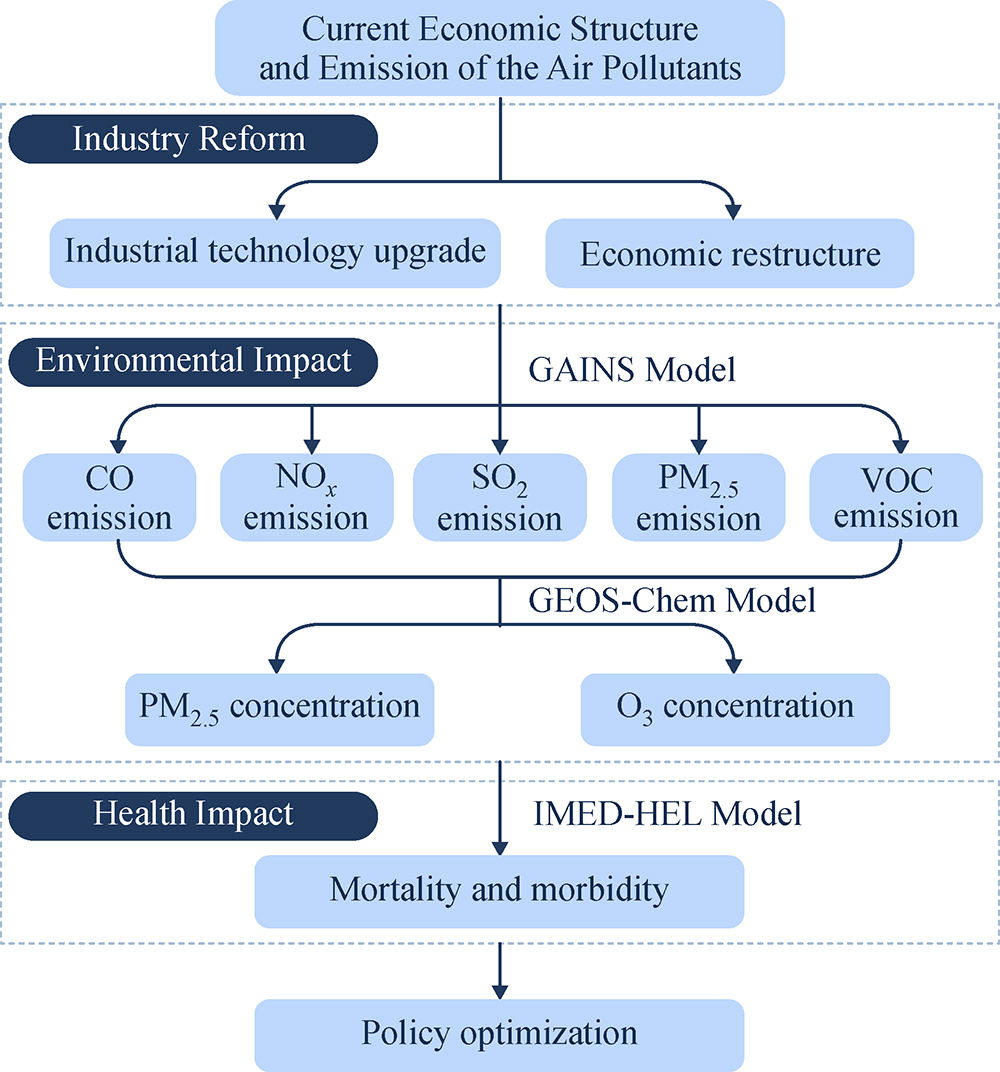 Impacts of industrial restructuring and upgrade on air quality & health are assessed. An integrated approach combining different models is used for the assessment. Industrial technology upgrading is more effective than economic restructuring. Ozone is much more difficult to mitigate than PM2.5.