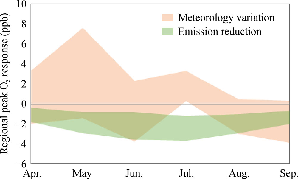 We have quantified the impacts of anthropogenic emissions reductions caused by the Air Pollution Control Action Plan and changes in meteorological fields between 2013 and 2017 on the warm-season O3 concentration in China using a regional 3D chemical transport model. We found that the impact on daily maximum eight-hour (MDA8) O3 concentration by the meteorological variation that mostly increased O3 was greater than that from emission reduction, which decreased O3. Specifically, the control measures implemented since 2013 in China have reduced SO2, NOx, PM2.5, and VOC emissions by 33%, 25%, 30%, and 4% in 2017, while NH3 emissions have increased by 7%. The changes in anthropogenic emissions lowered MDA8 O3 by 0.4–3.7 ppb (0.8%–7.6%, varying by region and month), although MDA8 O3 was increased slightly in some urban areas (i.e. North China) at the beginning/end of warm seasons. Relative to 2013, the average 2 m temperature in 2017 shows increments in North, North-east, East, and South China (0.34℃–0.83℃) and decreases in Central China (0.24℃). The average solar radiation shows increments in North, North-east, and South China (7.0–9.7 w/m2) and decreases in Central, South-west, and North-west China (4.7–10.3 w/m2). The meteorological differences significantly change MDA8 O3 by -3.5–8.5 ppb (-8.2%–18.8%) with large temporal variations. The average MDA8 O3 was slightly increased in North, North-east, East, and South China. The response surface model suggests that the O3 formation regime transfers from NOx-saturated in April to NOx-limited in July on average in China.