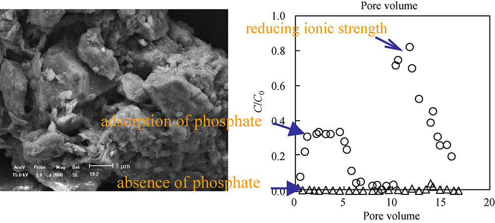 The widespread use of TiO2 nanoparticles (NPs) makes inevitable their release into the soil. Phosphate is also widespread within soil, and is likely copresent with TiO2 NPs. However, the influence of phosphate on deposition/release— and thereby on transport— of TiO2 NPs in soil is yet to be elucidated. In this study we conducted saturated column experiments to systematically examine the transport of TiO2 NPs in soil amended with phosphate at different ionic strengths (ISs) (1, 10, 100 mmol/L NaCl) and pHs (4 and 9). Results show that the deposition of TiO2 NPs decreased with decreasing IS, increasing pH, and when soil absorbed phosphate. These observations are qualitatively in agreement with Derjaguin-Landau-Verwey-Overbeek (DLVO) interaction energy calculations, because the repulsive energy barrier is larger and secondary minimum depth is smaller at a lower IS, higher pH, and in the presence of phosphate. Accordingly, both primary- and secondary-minimum deposition were inhibited. Interestingly, although the deposition was less at higher pH and in the presence of phosphate, the subsequent spontaneous detachment and detachment by reduction of solution IS in these cases were greater. In addition, the presence of phosphate in the solution can cause a small quantity of attached TiO2 NPs to detach, even without perturbations of physical and chemical conditions. Our study was the first to investigate the influence of phosphate on detachment of TiO2 NPs and the results have important implication for accurate prediction of fate and transport of TiO2 NPs in subsurface environments.