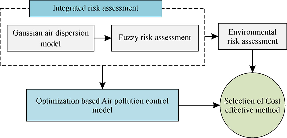 Open-pit metal mines contribute toward air pollution and without effective control techniques manifests the risk of violation of environmental guidelines. This paper establishes a stochastic approach to conceptualize the air pollution control model to attain a sustainable solution. The model is formulated for decision makers to select the least costly treatment method using linear programming with a defined objective function and multi-constraints. Furthermore, an integrated fuzzy based risk assessment approach is applied to examine uncertainties and evaluate an ambient air quality systematically. The applicability of the optimized model is explored through an open-pit metal mine case study, in North America. This method also incorporates the meteorological data as input to accommodate the local conditions. The uncertainties in the inputs, and predicted concentration are accomplished by probabilistic analysis using Monte Carlo simulation method. The output results are obtained to select the cost-effective pollution control technologies for PM2.5, PM10, NOx, SO2 and greenhouse gases. The risk level is divided into three types (loose, medium and strict) using a triangular fuzzy membership approach based on different environmental guidelines. Fuzzy logic is then used to identify environmental risk through stochastic simulated cumulative distribution functions of pollutant concentration. Thus, an integrated modeling approach can be used as a decision tool for decision makers to select the cost-effective technology to control air pollution.