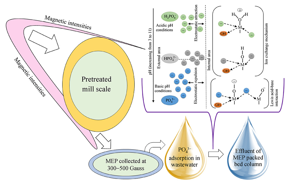 MEP were separated from mill scale at low magnetic intensity i.e., 300 to 500 gauss. The phosphate adsorption capacity of MEP was determined 6.41 mg/g. MEP packed-bed columns were successfully regenerated with alkaline solution.