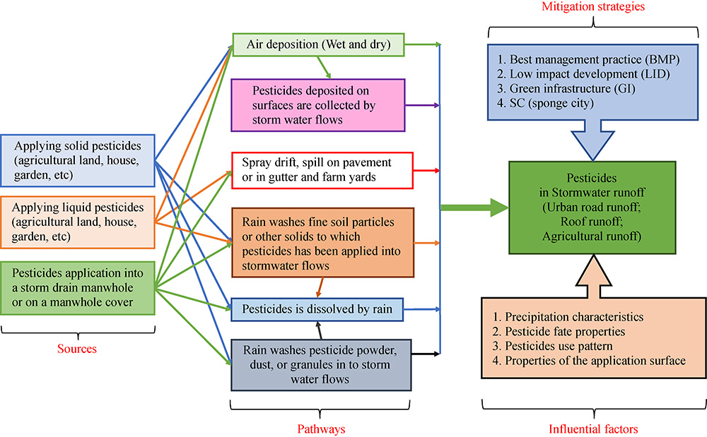 Recently, scientific interest has grown in harvesting and treating stormwater for potable water use, in order to combat the serious global water scarcity issue. In this context, pesticides have been identified as the key knowledge gap as far as reusing stormwater is concerned. This paper reviewed the presence of pesticides in stormwater runoff in both rural and urban areas. Specifically, the sources of pesticide contamination and possible pathways were investigated in this review. Influential factors affecting pesticides in stormwater runoff were critically identified as: 1) characteristics of precipitation, 2) properties of pesticide, 3) patterns of pesticides use, and 4) properties of application surface. The available pesticide mitigation strategies including best management practice (BMP), low impact development (LID), green infrastructure (GI) and sponge city (SC) were also included in this paper. In the future, large-scale multi-catchment studies that directly evaluate pesticide concentrations in both urban and rural stormwater runoff will be of great importance for the development of effective pesticides treatment approaches and stormwater harvesting strategies.