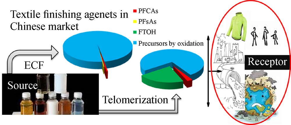 Organofluorinated surfactants are widely employed in textile finishing agents (TFAs) to achieve oil, water, and stain repellency. This has been regarded as an important emission source of per-and polyfluoroalkyl substances (PFASs) to the environment. China is the biggest manufacturer of clothes, and thus TFA production is also a relevant industrial activity. Nevertheless, to date, no survey has been conducted on PFAS contents in commercially available TFAs. In the present study, TFA products were investigated by the Kendrick mass defect method. The quantification results demonstrated a significant presence of perfluorooctane sulfonate (0.37 mg/L) in TFAs manufactured by electrochemical fluorination technology. The products obtained by short-chain PFAS-based telomerization were dominated by perfluorooctanoic acid (mean concentration: 0.29 mg/L), whose values exceeded the limits stated in the European Chemical Agency guidelines (0.025 mg/L). Moreover, the total oxidizable precursor assay indicated high levels of indirectly quantified precursors with long alkyl chains (C7–C9). Together, these results suggest that there is currently a certain of environmental and health risks in China that originates from the utilization of TFAs, and a better manufacturing processes are required to reduce such risks.
