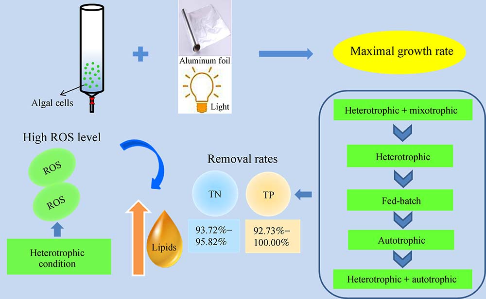 Heterotrophic cultivation caused high level of ROS and high lipids accumulation. HMTC is the best culture strategy for improving the microalgal biomass. Chlorella sp. HQ had great nutrient removal capacity under five culture strategies.