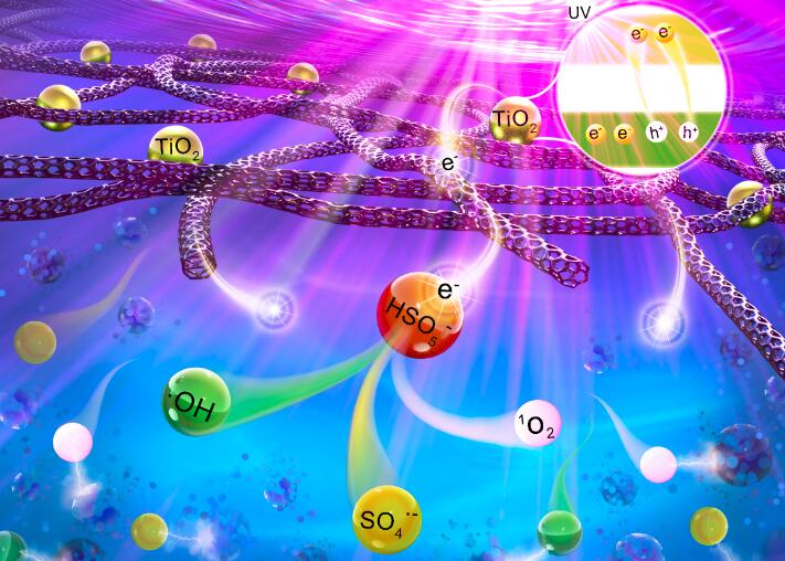 CNT-TiO2 composite is used to activate PMS under UV-light assistance. Superior performance is due to the enhanced electron-transfer ability of CNT. SO4•−, •OH and 1O2 play key roles in the degradation of organic pollutants.