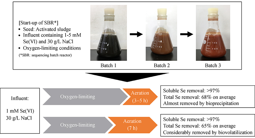 Removal of selenate in saline wastewater by activated sludge was examined. Sequencing batch reactor was operated under alternating anoxic/oxic conditions. Above 97% removal of soluble selenium (Se) was achieved continuously. Major Se removal mechanism varied depending on the length of aeration period. Various Se-reducing bacteria likely contributed to coordinately to Se removal.